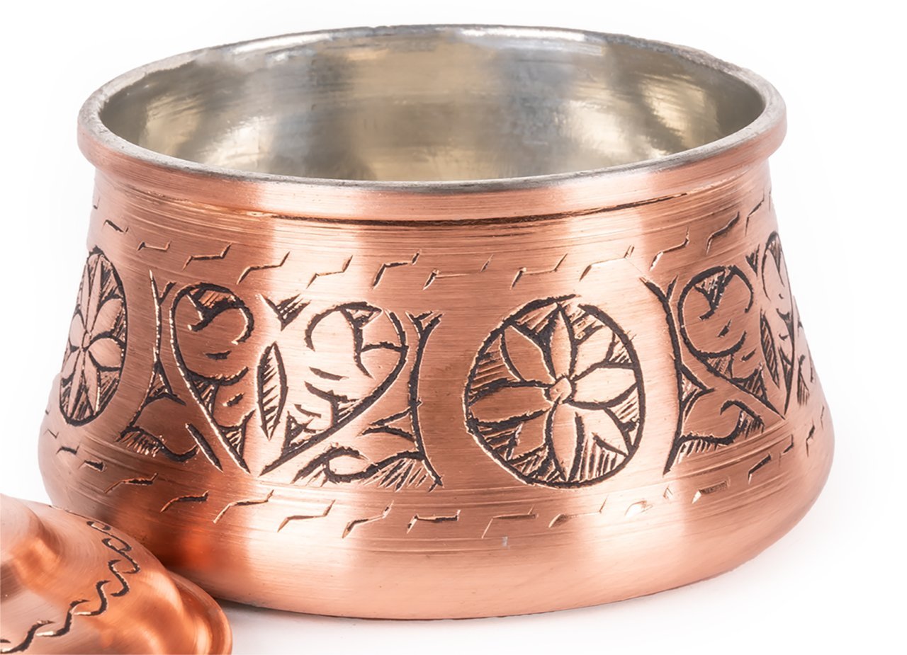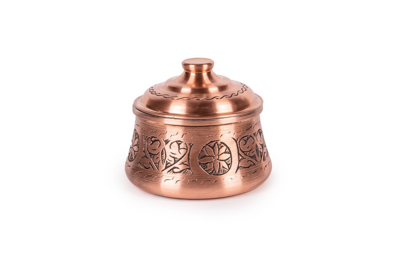 Handygoo Kırmızı Eskitme Bakır Şekerlik ile oryantal kültürün esintilerini doyasıya yaşayın. Tüm ürünlerde olduğu üzere; şekerliğiniz üzerinden yıllar geçtikçe, tıpkı insanlar gibi yaşlandıkça daha iyi görünme ve daha fazla karakter kazanma eğilimindedirler. İki parçadan oluşan ürün, yatay alt yüzeyinin üstünde yukarıya doğru hafif kavislidir. Kapak parçası, alt kısmı üzerine uyumlu olarak gelen ince yiv izlerine sahiptir. Alt kısmın yüzeyi oryantal esintileri ile dolu motiflerle süslenmiştir.