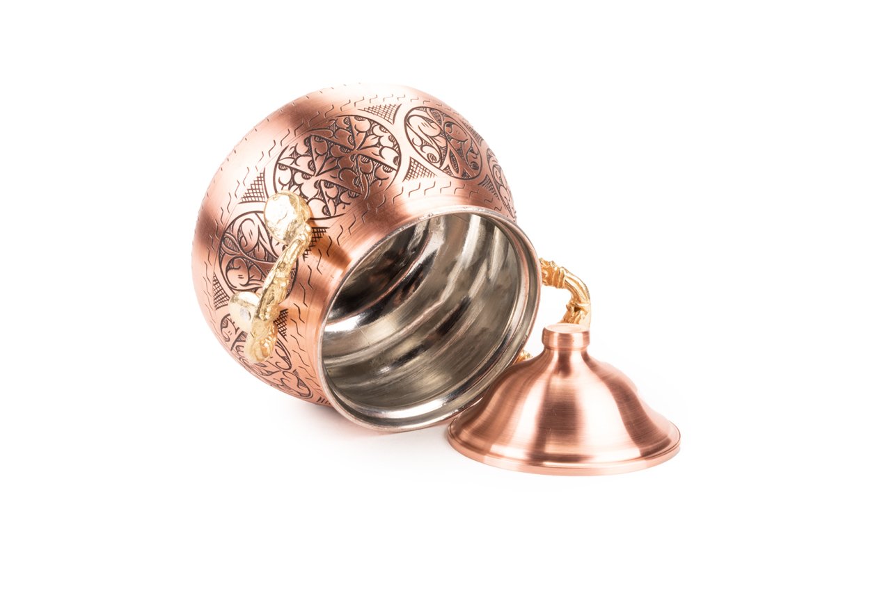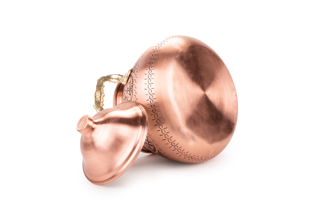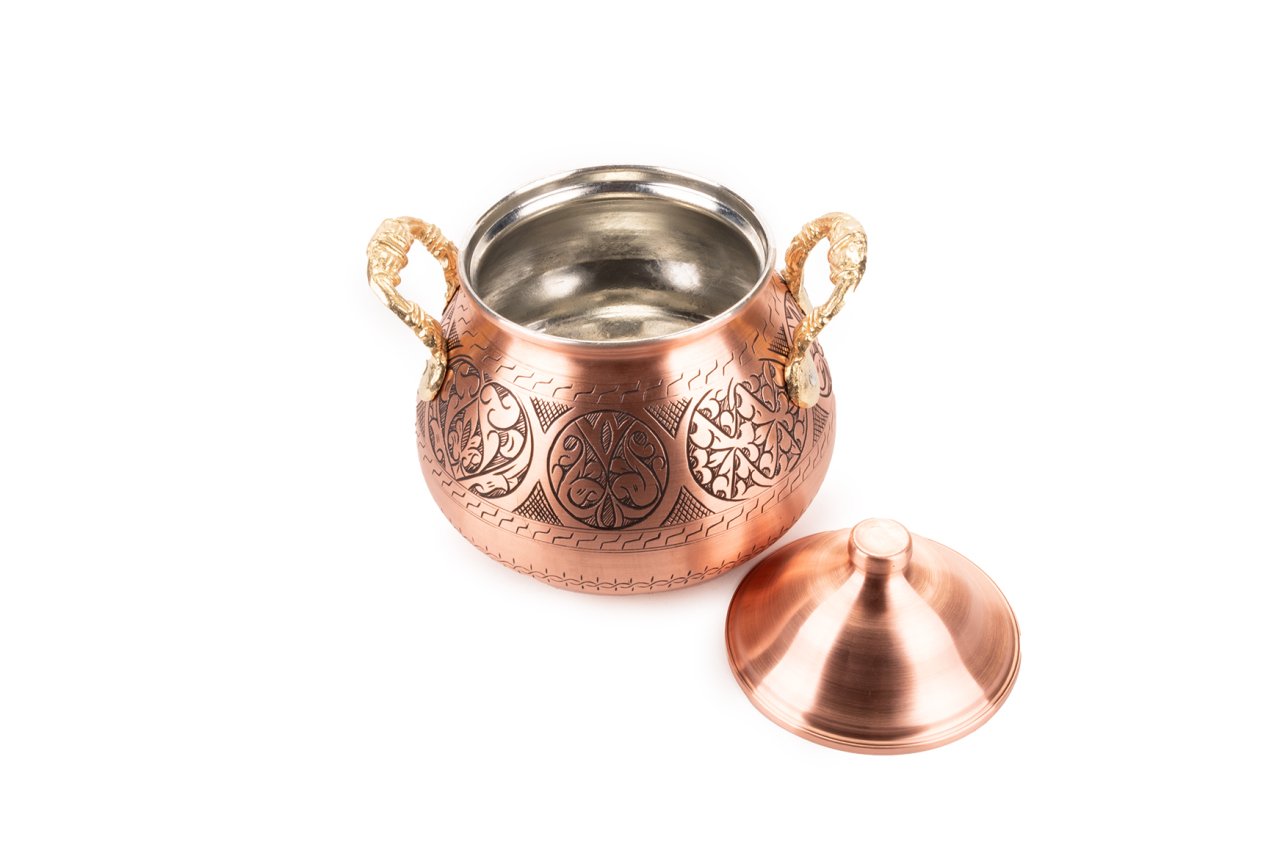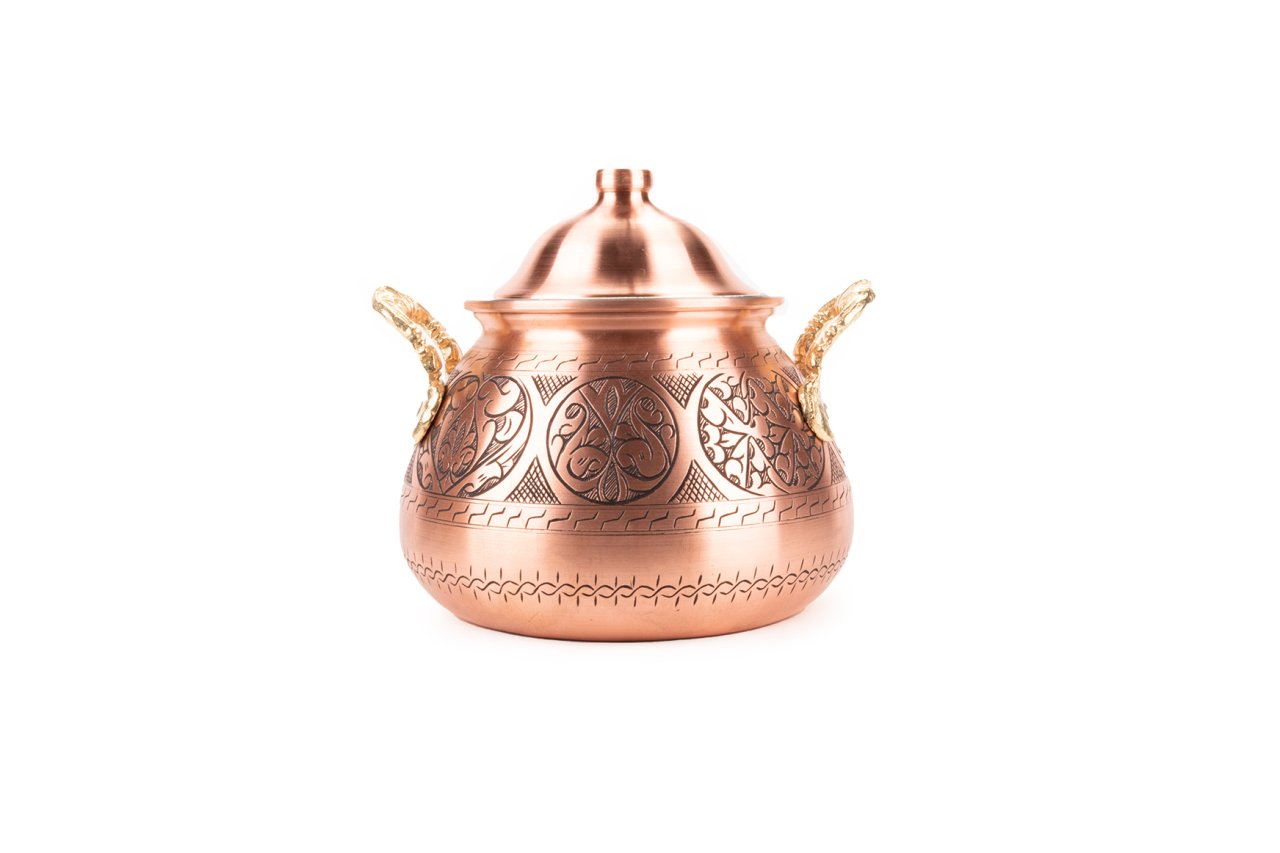 Çift kulplu Handygoo Kırmızı Eskitme Büyük Bakır Güveç Tenceresi, klasik tencere tasarımlarından farklı olarak ön plana çıkıyor. Üzerindeki el işlemesinin büyüsünden, akıcılığından ve detayların hareketliliğinden hoşlananlar için tasarlandı. Güveç başta olmak üzere, sıcak yada soğuk tüm çorba, yemek ve benzeri servis ve pişirimleriniz için kullanım rahatlığı sunarken anı zamanda eviniz için son derece dekoratif bir görünüme sahiptir. Ustaların ruhundan ellerine süzülen duyguları ile dövülerek şekil aldığı bakır güveç tenceresi ürünü, en altından başlayarak el işi keski işlemesi ile çok sık, ince ve şık nakışlar ile süslenmiş, bu nakışlar, tencerenin tamamlayıcı parçası olan kapak üzerinde de detaylandırılarak, ürün üzerinde bütünlük sağlanmıştır. İç kaplaması tamamen kalaylanmıştır. Gurme tercihler ve kaliteye adanmışlığın bir sembolü olan bu tencereler, mutfağınızda kendini lezzete adamış bir şefin yaşadığına işaret edecektir. Yerel özgünlüğe verilen değerin de elçisi olan mutfaktaki bakırlarınız, ev dekorunuzun her türlü katmanıyla kolayca bütünleşip, bir zenginlik yaratacaktır. Kulplar pirinç kaplamadır. Ürünün ağız çapı 13 cm, taban çapı 15 cm dir. Yüksekliği 19 cm olan bakır güveç tencere, 2,8 lt sıvı hacmine sahiptir. Kalın bakırdan üretilmiştir. İç kısımlar güvenle kullanımınız için kalaylanmıştır.
