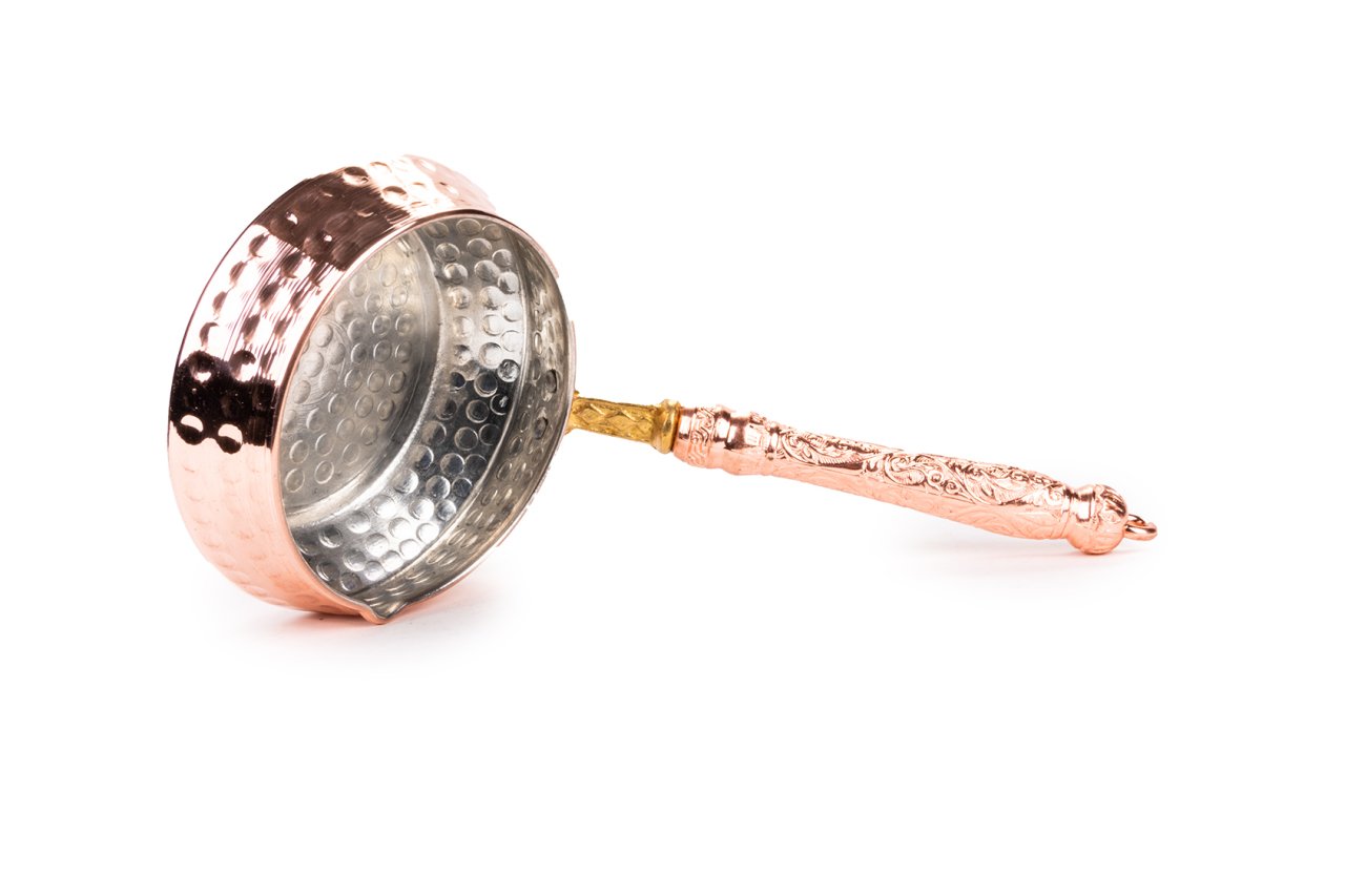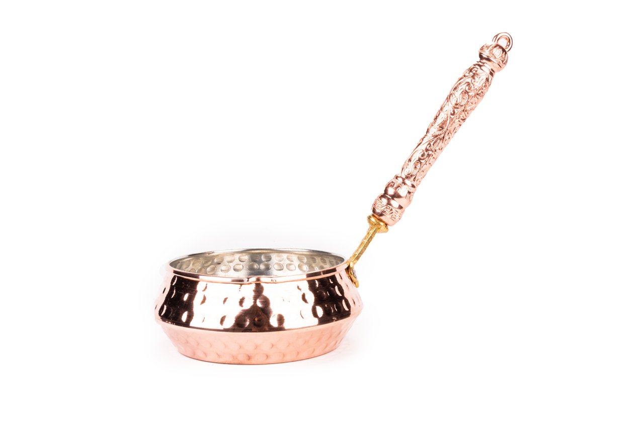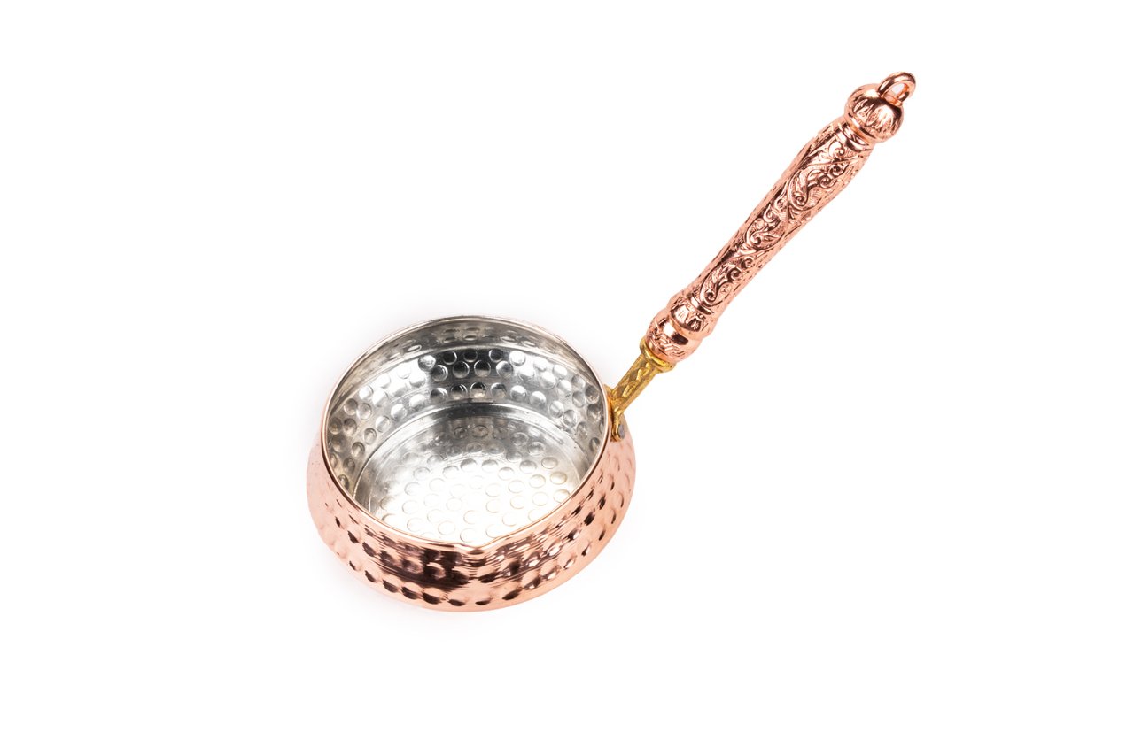 Handygoo Kırmızı Saplı Kırmızı Dövme Bakır Sosluk, lezzetli soslar ve yağ kızdırmak için kullanabileceğiniz son derece pratik ve dekoratif bir tavadır. Ürün 11 cm çap, 5 cm yükseklik ve 18 cm lik sap ölçüleri ile her mutfakta elinizin altında olmasını isteyebileceğiniz bir üründür. Ürünümüz, el yapımı olup, kalın bakırdan üretilmiştir. Üzerindeki dövme işçiliği Gaziantep'li bakır işleme ustalarımız tarafından yapılmıştır. %100 el yapımı olmasından dolayı ürün size özeldir.