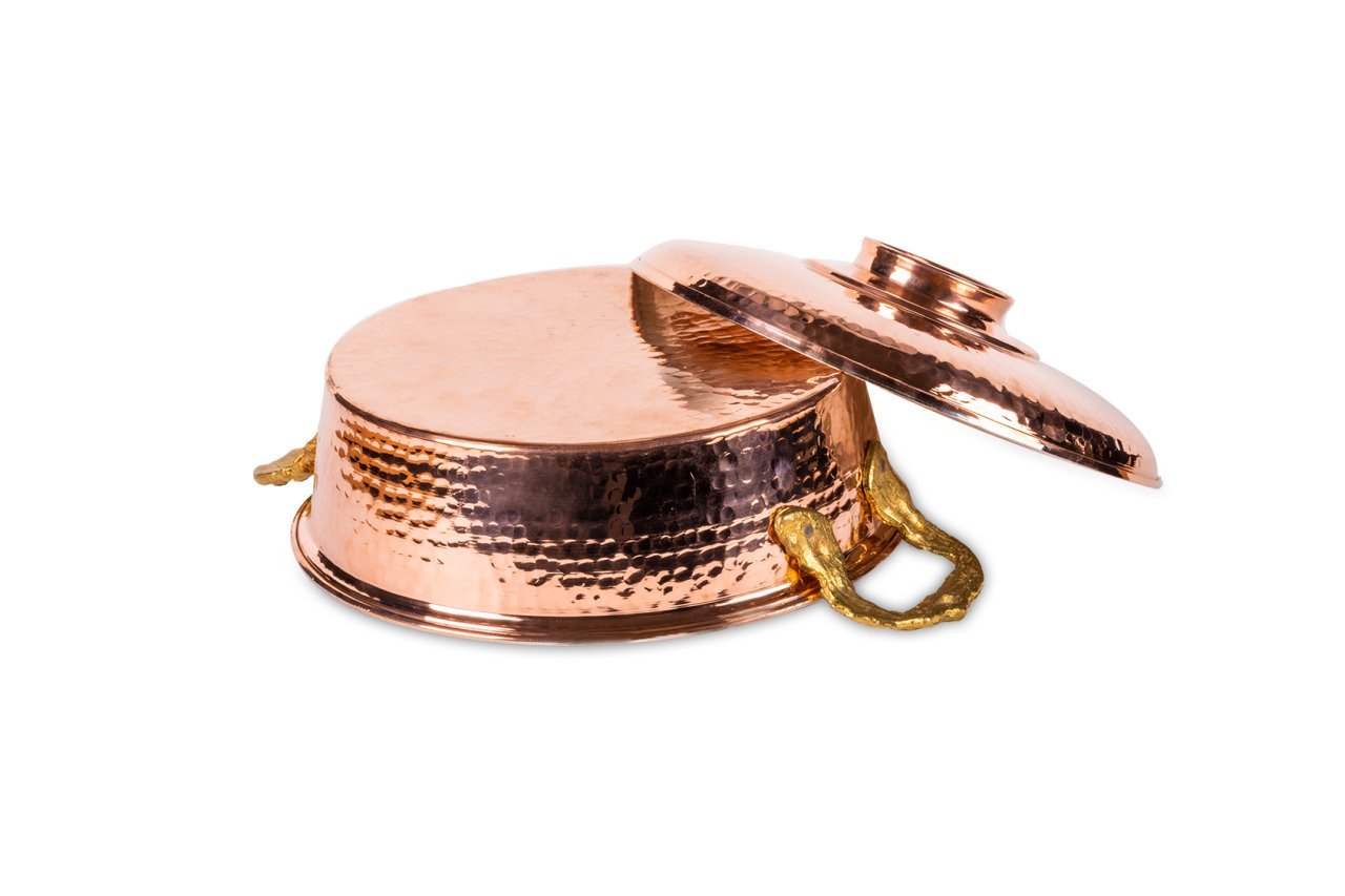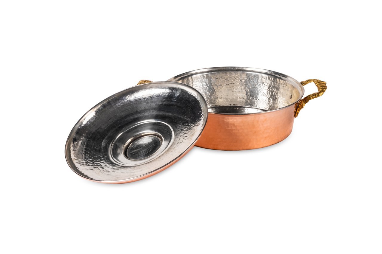 Handygoo Klasik Dövme Bakır Tencere, pilav tenceresi başta olmak üzere, tüm yemeklerinize lezzet katmak için tasarlandı. Günlük kullanıma uygun olacak şekilde iç yüzeyi tamamen kalaylanmıştır. Kendi imalatımız olup, kalın bakırın elde çekiç ile dövülmesi ile üretilen dövme bakır tencere 26,5 cm çap ölçüsüne sahiptir. Kulbundan kulbuna 35 cm dir ve derinliği 8 cm dir. Mutfağınızda dekoratif olarak diğer tencereleriniz ve malzemeleriniz ile uyumlu olacak şekilde kullanabileceğiniz bakır tencereyi çok seveceksiniz.