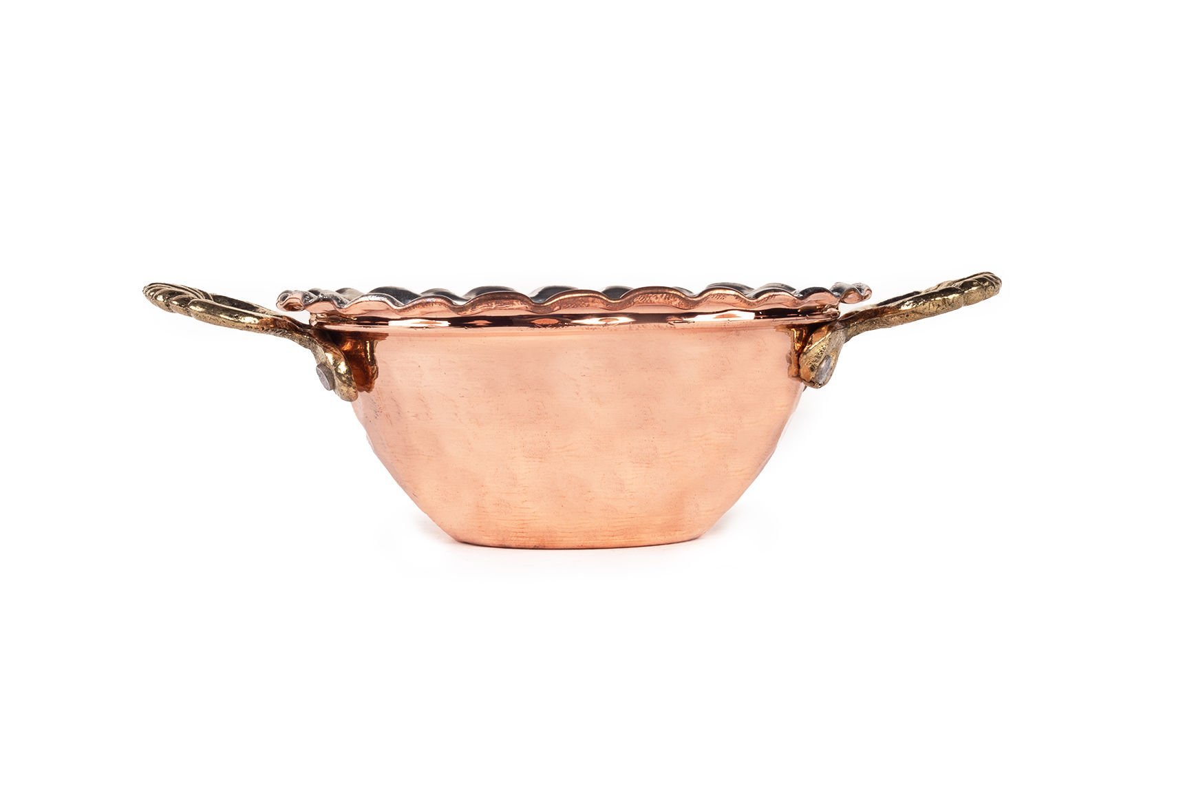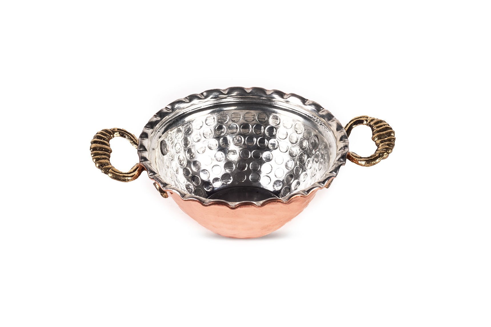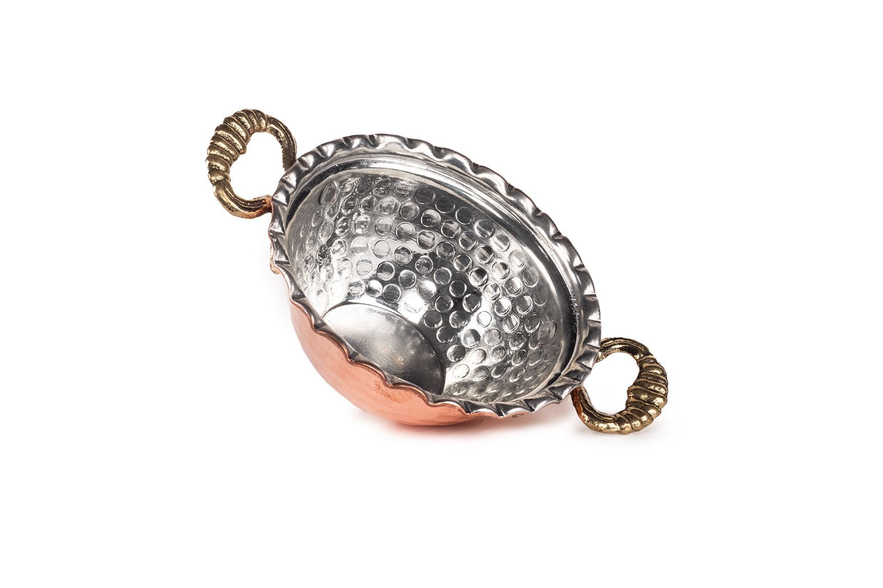 Handygoo Mini Bakır Kahvaltılık, kahvaltı sofralarınızda, kahvaltılıklarınızı sunmanın en yeni ve dekoratif yöntemlerinden biri olarak karşınızda. Tamamen el yapımı ve %100 bakır olan ürünümüzün içi kalaylı olup günlük kullanıma uygundur. Mini bakır kahvaltılık, dekoratif görüntüsü ile sadece bir kahvaltılık değildir. Bulunduğu her ortamda dikkatleri üzerine çekecektir. çapı 9,5 cm, derinliği 5 cm ve kulplarından ölçüldüğünde çapı 14 cm dir. Sadece kahvaltı sunumlarınız için değil, aklınıza gelecek her türlü sunumunuzda da rahatlıkla kullanabilirsiniz.