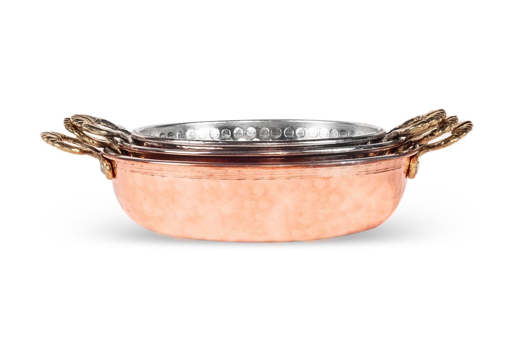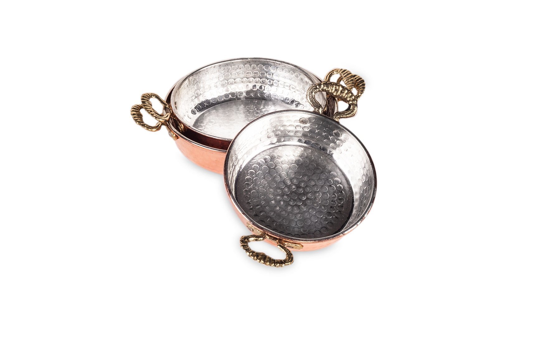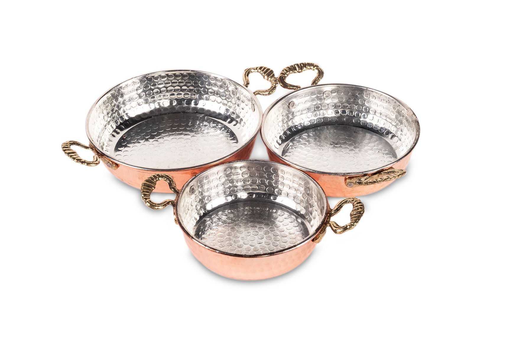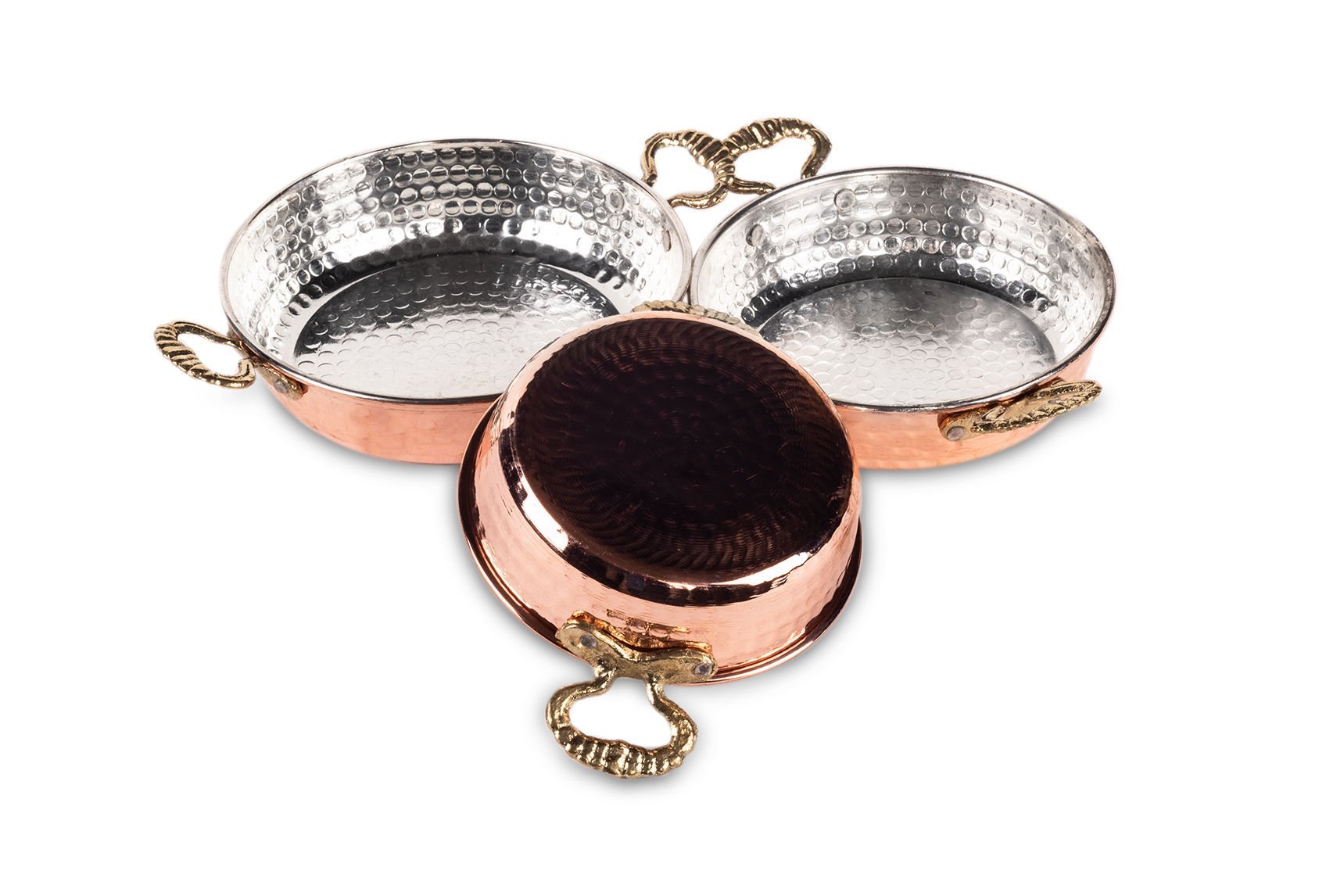 Handygoo Mini Bakır Sahan Seti, dövme bakırdan imal edilmiştir. %100 bakırdır. Bakır sahan setinin, iç kısmı kalaylı ve günlük kullanıma uygun olup, sahip olduğu iki adet kulpun ham maddesi pirinçtir. Ergonomik olarak tasarlanmış olan bu kulplar, sahanın kolaylıkla kavranmasına olanak sağlamaktadır. Kahvaltı ve yemek sofralarınızda kullanımı çok kolay ve dekoratif bir seçenek olarak karşınıza çıkmaktadır. Özellikle kahvaltı sofralarınızda kullanmaktan zevk alacağınız %100 bakır ve el yapımı olan ürünümüzü zeytin, peynir, yumurta, salata vb. tüm yiyeceklerinizin servisinde rahatlıkla kullanabilirsiniz. Ürün ısı muhafazasında da çok üstün özellikler sergilemektedir. Hem dipten hem de yanlardan sağladığı son derece eşit ısı dağılımı müthiş bir fark yaratacaktır. Ayrıca, bakır sahan seti tamamen el işi olduğundan, dayanıklılığı uzun yıllar sürecek, keyifli ve zevkle kullanımınıza olanak sağlayacaktır. Setimiz aşağıda belirtilen çap ölçülerine sahip sağanlardan oluşmaktadır.