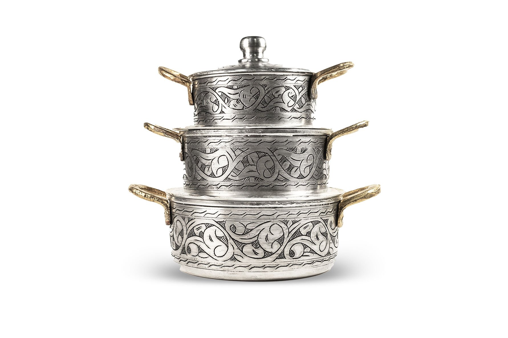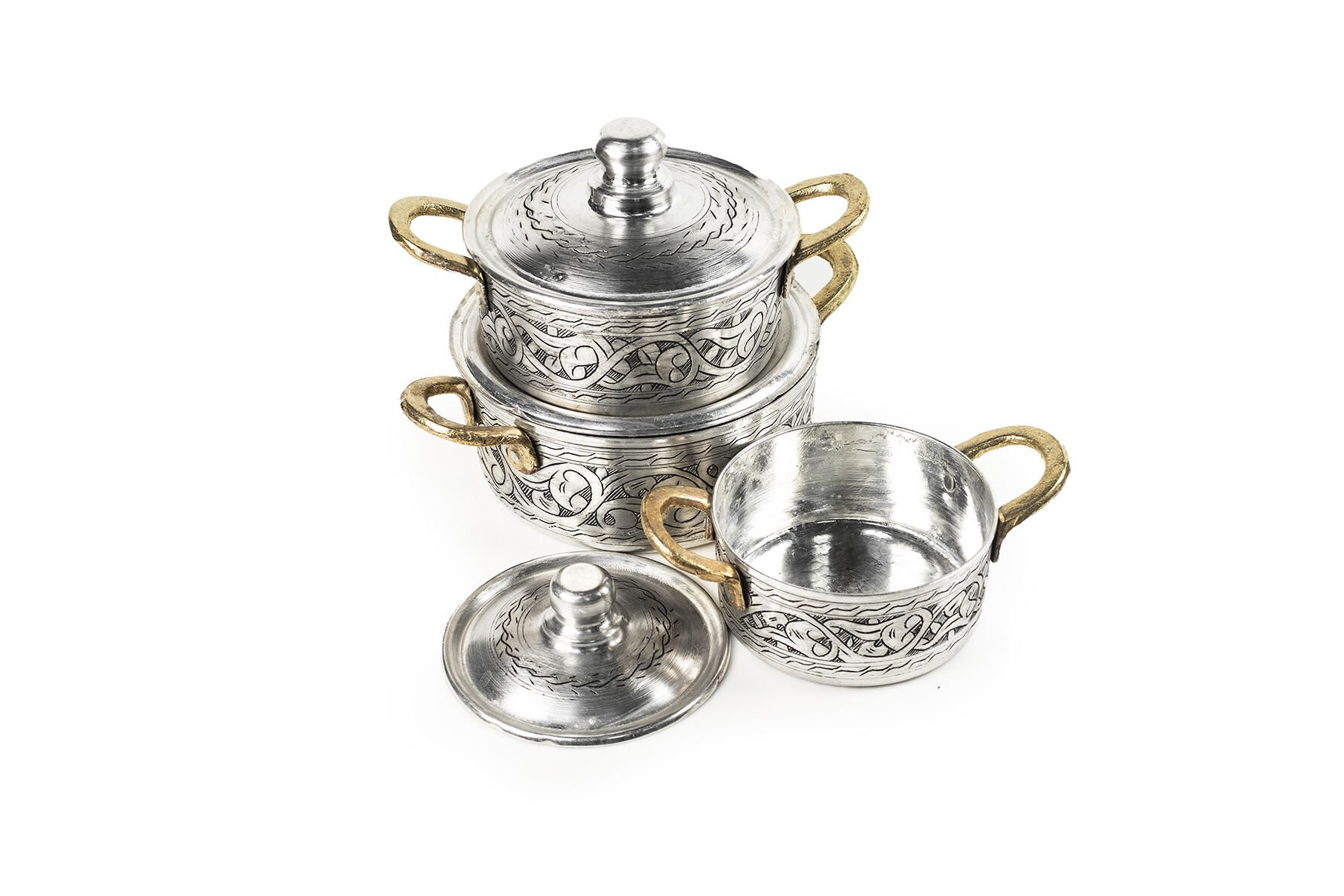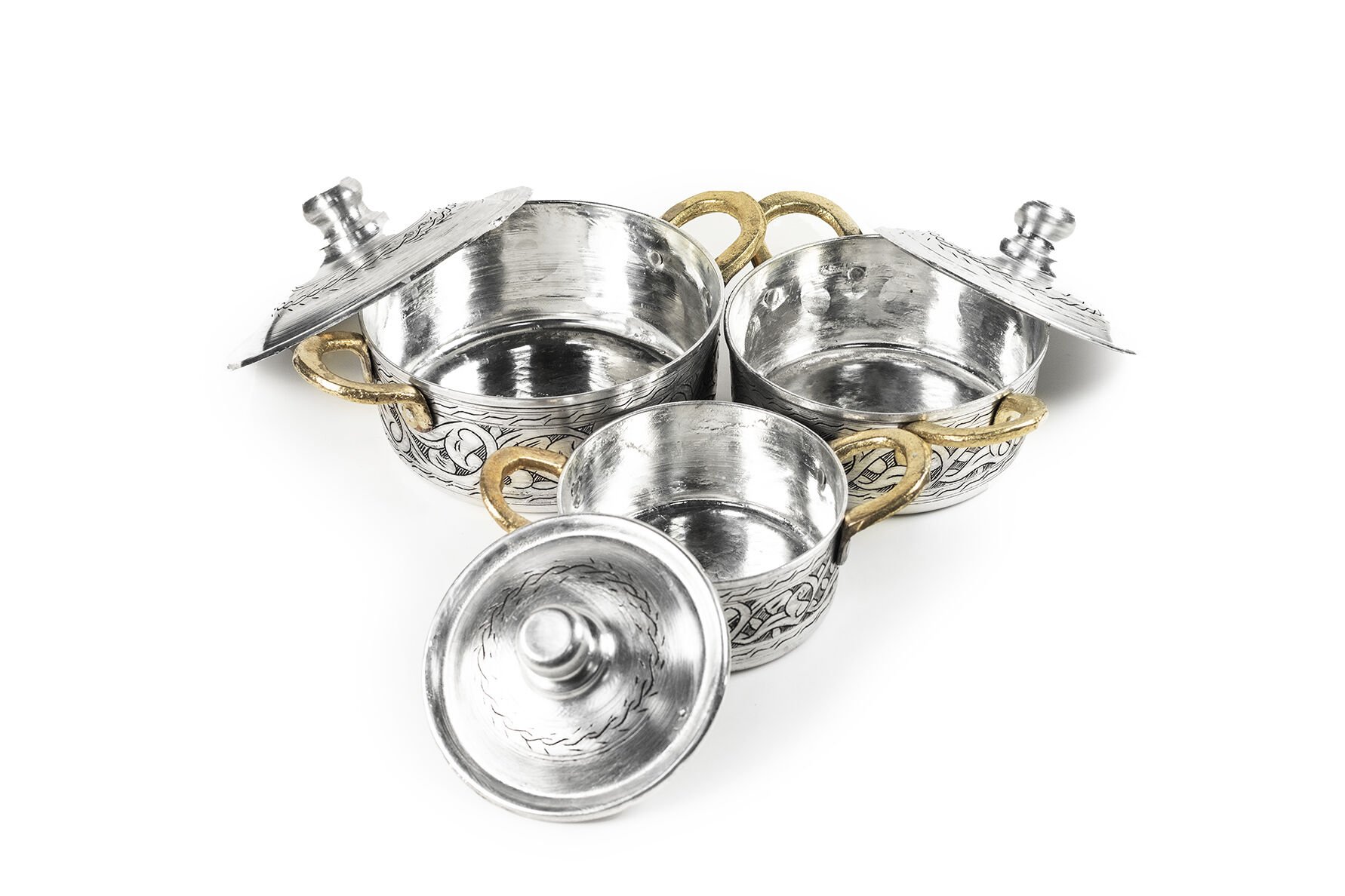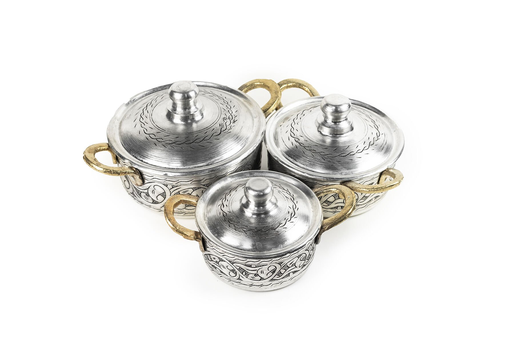Handygoo Mini Bakır Tencere Seti, %100 bakır ve el nakışıdır. Kalın bakırdan üretilmiştir. Setimiz içerisinde 3 farklı boy kalaylı tencere bulunmaktadır. Bakır Tencere seti ürünümüzün içerisinde yer alan en ufak tencere 13 cm çapında ve 10 cm derinliğindedir. Kulplarından ölçüldüğünde çapı 19 cm dir. Orta boy tenceremiz 15,5 cm çap ve 11 cm derinlik ölçüsüne sahiptir. Kulplarından ölçüldüğünde ise 22 cm çap değeri vardır. En büyük tenceremiz ise 18 cm çapında ve 12 cm derinliğindedir. Kulplarından ölçüldüğünde 24,5 cm çapa sahiptir. Bakır Tencere Seti ürünümüzün tüm parçaları yemek pişirmeye ve servis etmeye uygundur. İç kısımları kalay kaplıdır. Tüm ürünlerimizde olduğu gibi ücretsiz kargo fırsatı bu ürünümüzde de yer almaktadır. Keyif ile kullanacağınız yada dekoratif olarak bulundurmak isteyeceğiniz ürünümüz için çok avantajlı fırsatları kaçırmayınız.