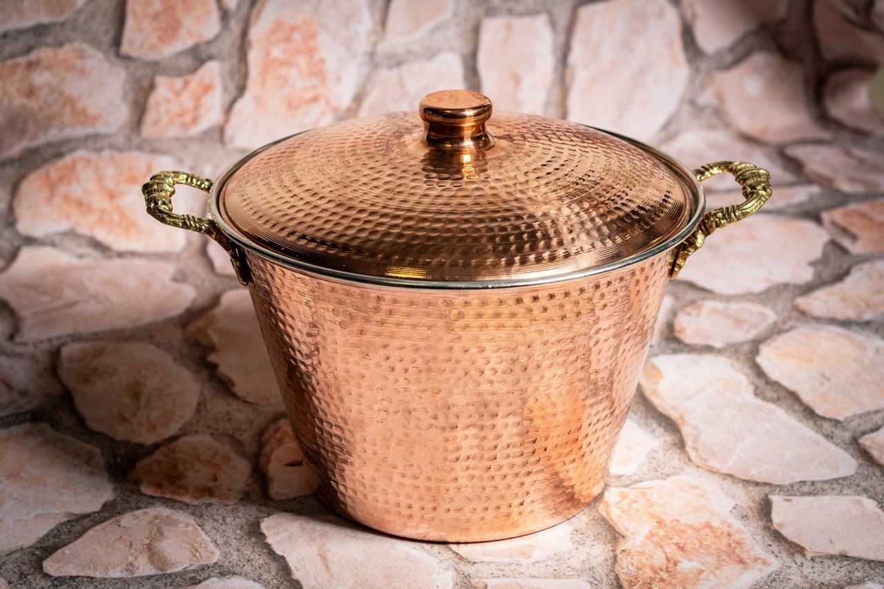 Handygoo Nefertum Dövme Bakır Perde Pilavı Tenceresi, ülkemizin yöresel ve eşsiz lezzetlerinden biri olan perde pilavını, sofralarınıza layık bir şekilde pişirmeniz için tasarladığımız modelimizdir. %100 dövme bakırdan ürettiğimiz dövme bakır perde pilavı tenceresi modelimiz, kalın bakırdan üretilmiş olup 2,4 kg ağırlığındadır. 30 cm ağız çap ve 20 cm derinliğe sahip olan perde pilavı tenceresi modelimiz 8-10 kişi için son derece idealdir. Tamamı ile el yapımı ve el dövmesi olan ürünümüzü ocak ve fırınlarınızda (indüksiyonlu ocak hariç) rahatlıkla kullanabilirsiniz. Kalın olmasından dolayı uzun zaman boyunca fırın içinde kalmaya dayanıklıdır. Sadece perde pilavı değil aynı zamanda tüm sulu yemek ve diğer pişirimlerinizde de rahatlıkla kullanabilirsiniz. Sahip olduğu dövme bakırın göz alıcı görüntüsü ile de son derece dekoratiftir. Tüm diğer bakır ürünlerimiz ile son derece uyumludur.