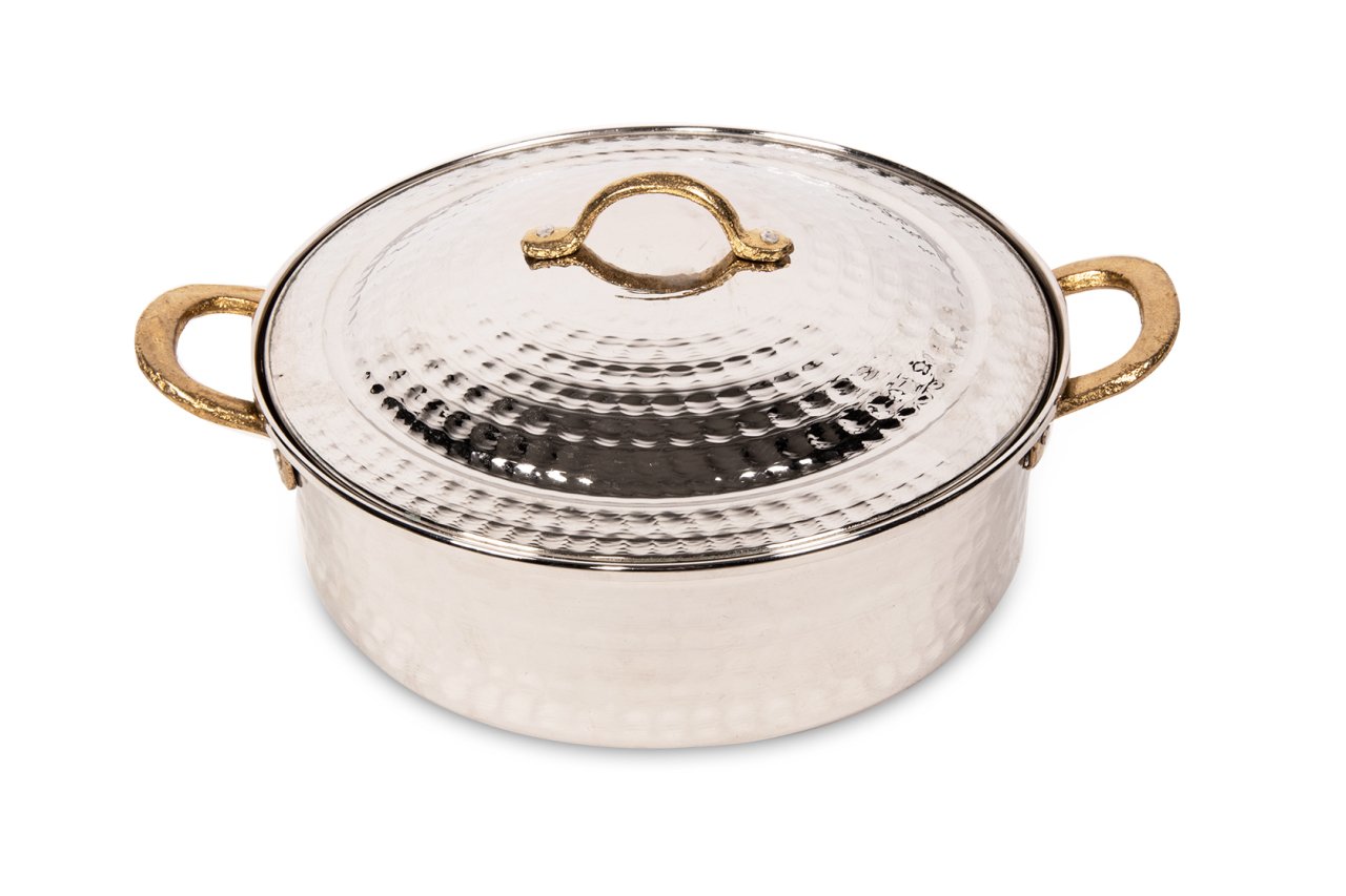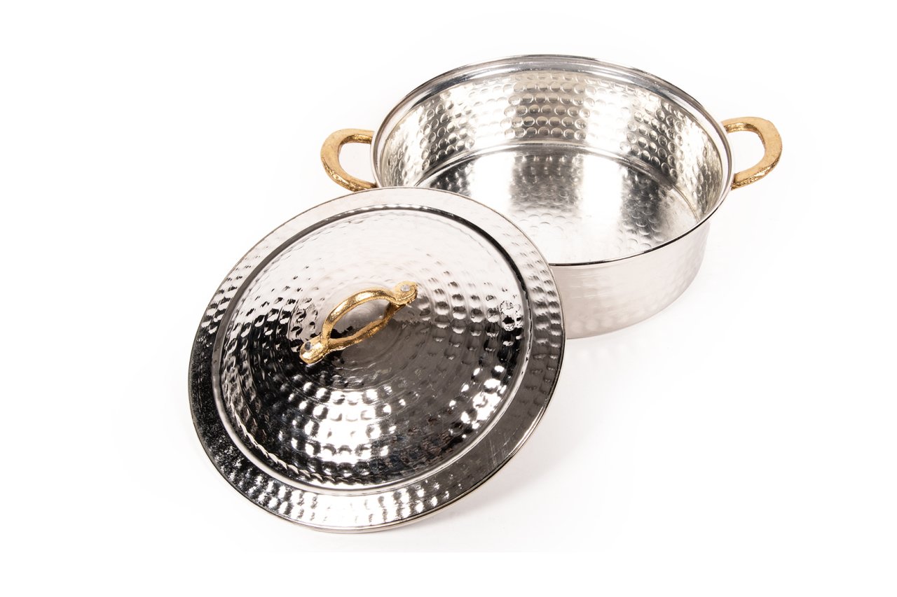 Handygoo Nikelajlı Dövme Bakır Tencere, son derece modern fakat bir o kadar da geleneksel tasarımı ile göz dolduruyor. 21,5 cm çap ve 6,5 cm derinliği ile pilav, karnıyarık vb. yemeklerinizi bakır tencere lezzetinde pişirmek için son derece kullanışlıdır. Kapağındaki özel tasarımımız ile birlikte, kapak kenarları dövme bakır tencere dışına damlatma yapmamaktadır. Günlük kullanımda güvenle kullanımınız için iç kısmı tamamen kalaylanmıştır. Ürün bakır kaplama değildir. Gerçek bakırdan elde şekil verilerek ve yine elde çekiç ile dövülerek üretilmiştir. Kalın bakırdan üretilen ürünümüz kendi imalatımızdır. Parlak görünümü için nikelajlanmıştır. Ürünümüz kararma yapmamaktadır. Mutfağınızda severek kullanabileceğiniz ürünümüz, mutfağınızdaki diğer çelik, granit vb tencerelerinizi de dekoratif olarak tamamlayacaktır.