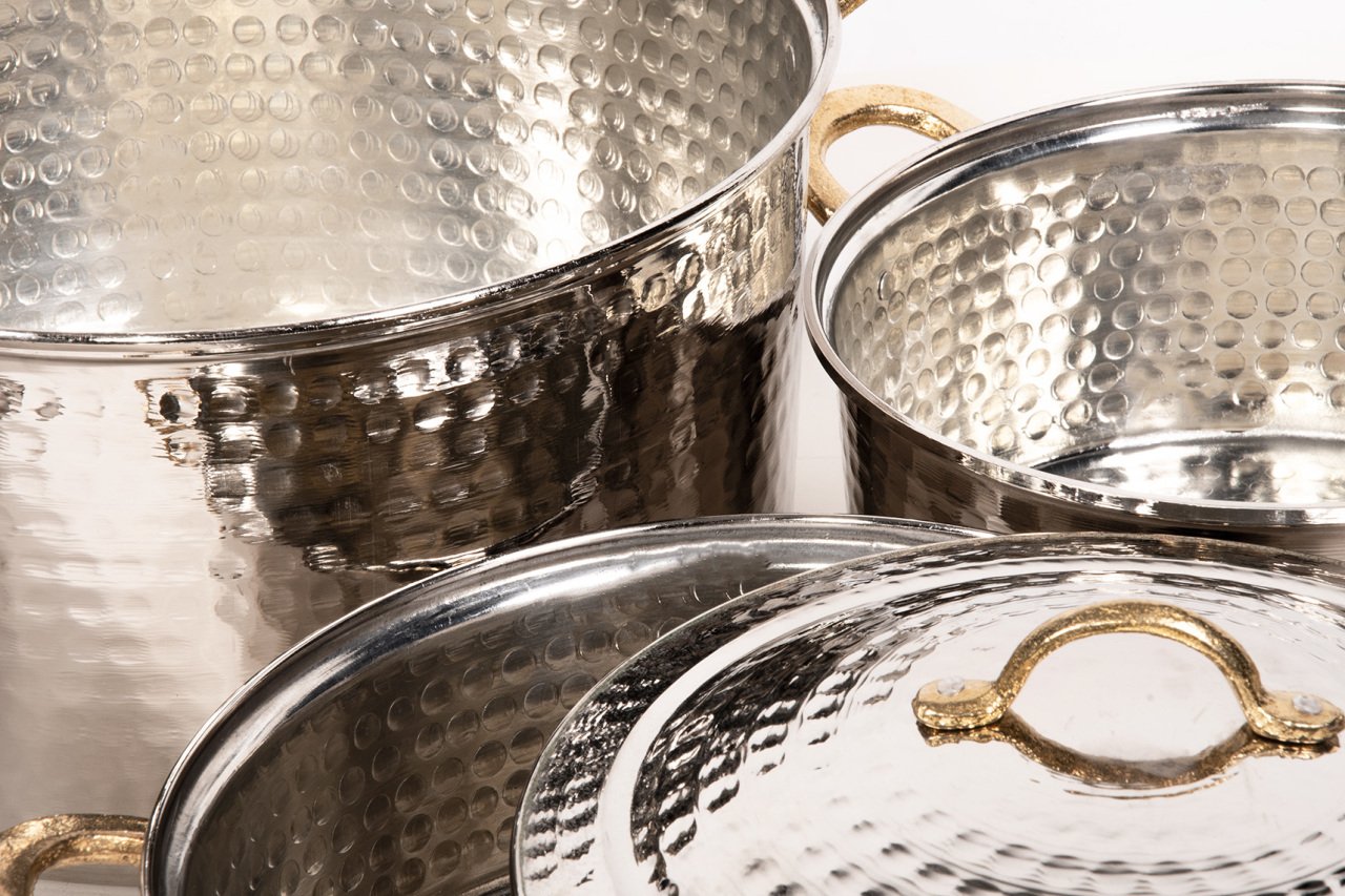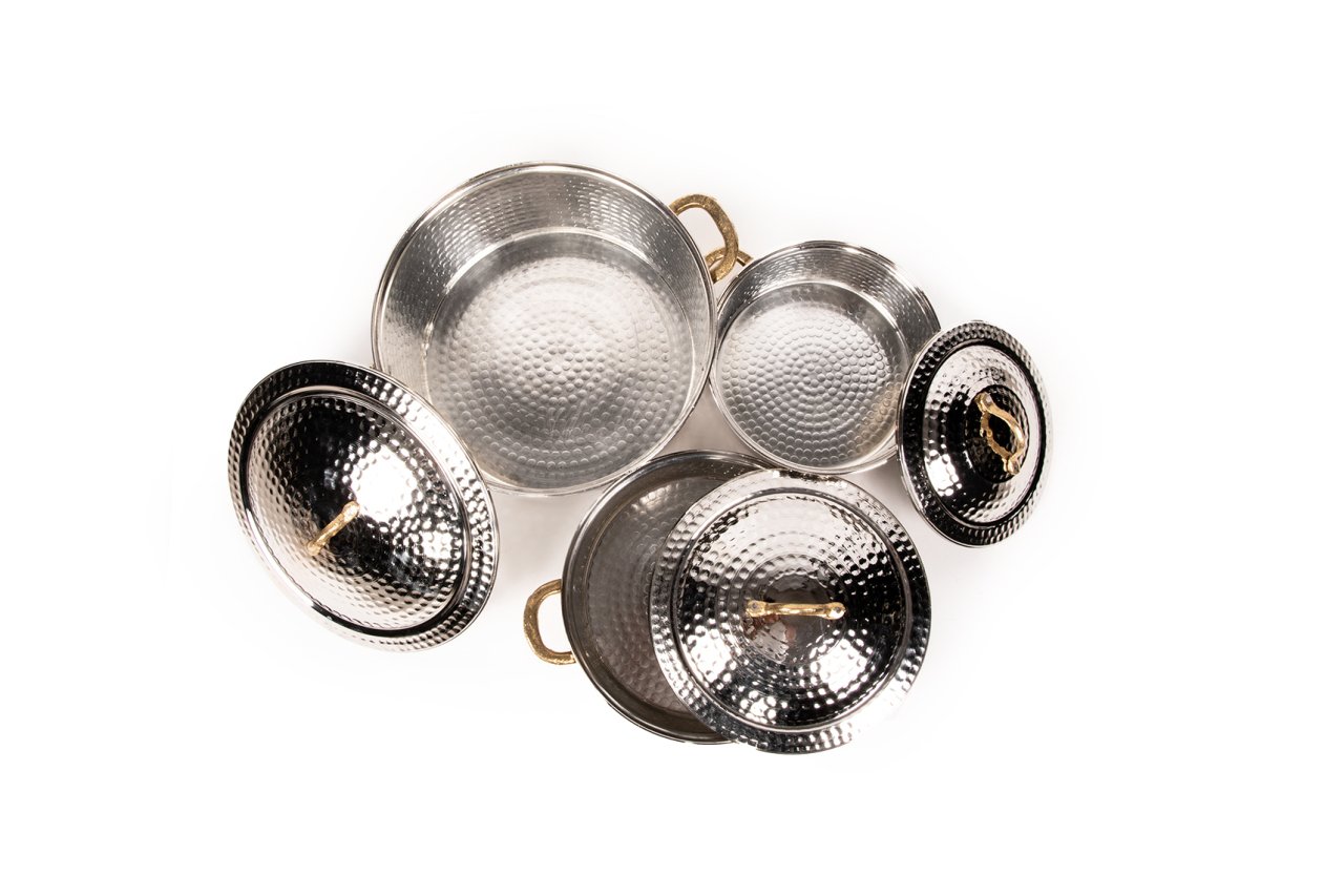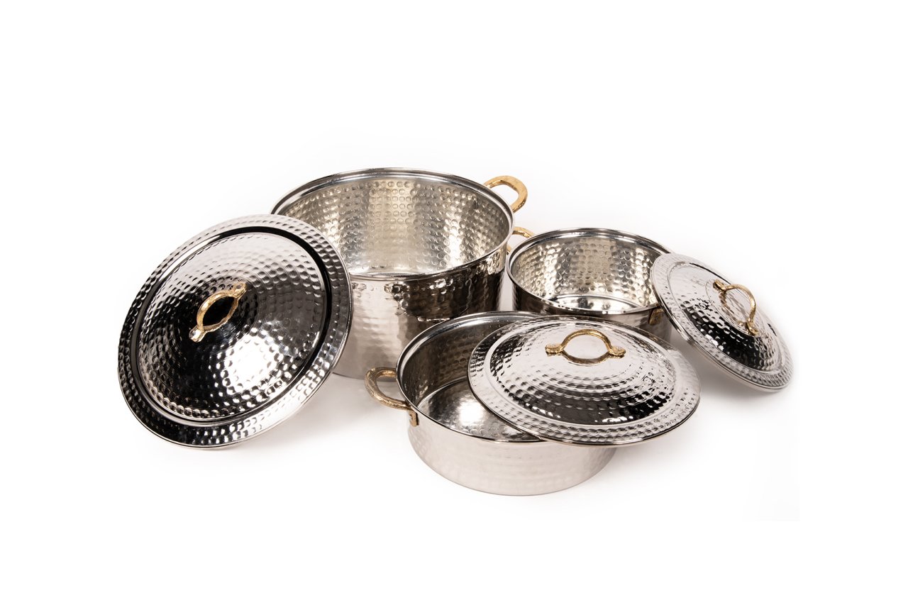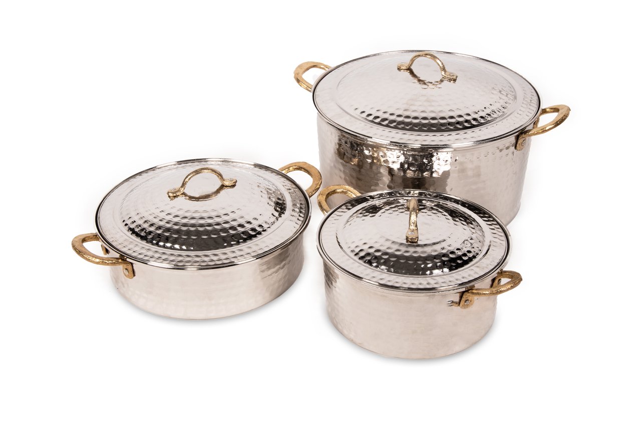 Handygoo Nikelajlı Hammer Wind Dövme Bakır Tencere Seti, 3 boy, modern ancak geleneksel tarzda ürettiğimiz dövme bakır tencere modellerimizi içermektedir. Set içerisinde büyük ve ufak boy derin bakır tencere ve orta boy pilav tenceresi modelimiz yer almaktadır. Set içerisindeki büyük boy tenceremiz 29,5 cm çapında ve 15 cm derinliğindedir. 8 LT hacmi bulunmaktadır. Ufak boy derin dövme bakır tenceremiz 21,5 cm çapında ve 10 cm derinliğindedir. 2 LT hacmi bulunmaktadır. Set içerisindeki orta boy dövme bakır pilav tenceresi modelimiz 25,5 cm çapında ve 8 cm derinliğindedir. Tüm yemekleriniz için birbirinden farklı boy seçeneği sunan setimiz, mutfağınızdaki dekorasyonu bütünlerken, elinizin altında sürekli bulundurmak istediğiniz ürünümüz olacaktır. Günlük kullanıma son derece uygun olan bakır tencere modellerimizin iç yüzeyi güvenle kullanımınız için kalaylanmıştır. Tüm tencerelerimiz tamamen el yapımı olup, G.Antep'li bakır ustalarımız tarafından elde dövülerek üretilmiştir. Dolayısı ile ürünlerimiz tamamen size özeldir. Ürünlerimiz kalın bakırdan üretilmektedir. Parlak görünümü için nikelajlanmış olup kararma yapmamaktadır. Dövme bakır tencere seti ürünümüze, tüm kredi kartlarına peşin yada taksit imkanları ile güvenle sahip olabilirsiniz.