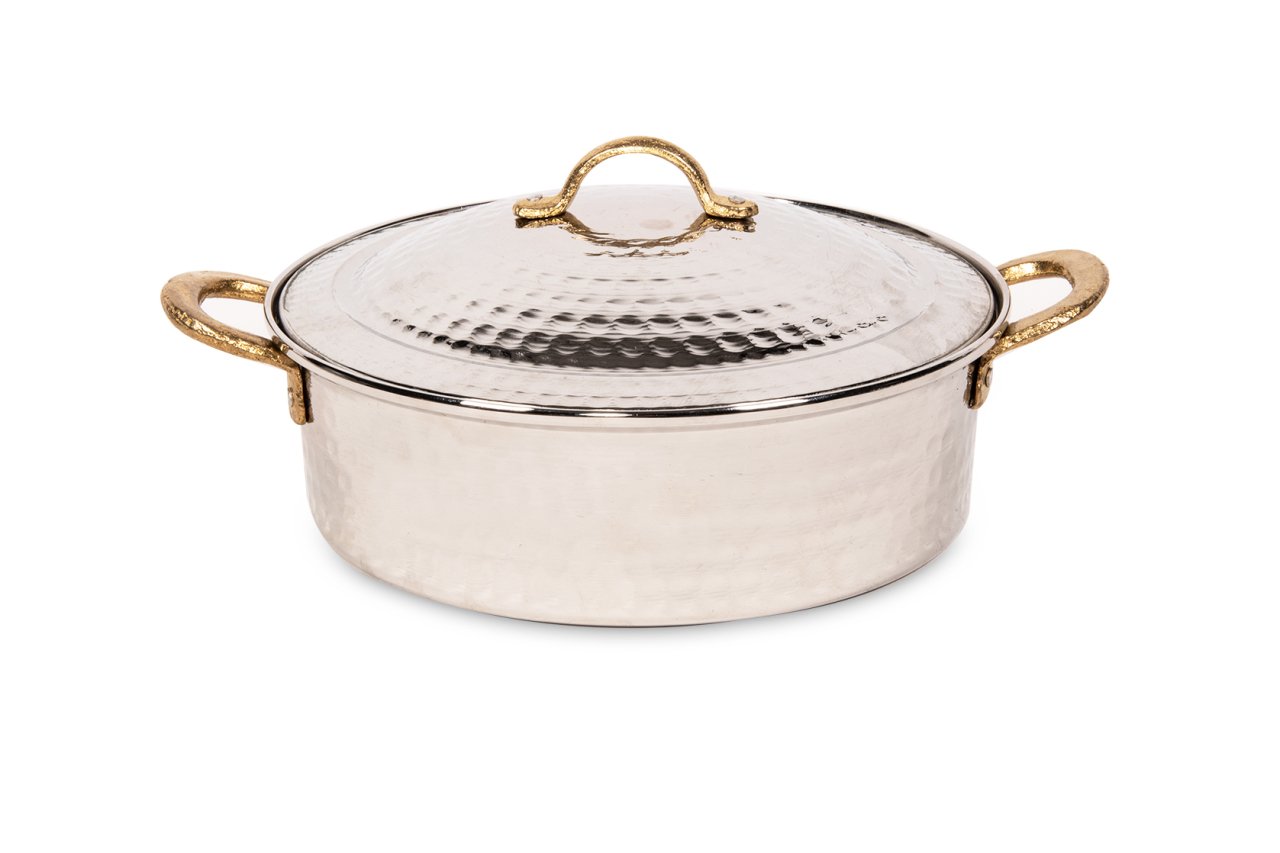Handygoo Nikelajlı Orta Boy Dövme Bakır Tencere, son derece modern fakat bir o kadar da geleneksel tasarımı ile göz dolduruyor. 25,5 cm çap ve 8 cm derinliği ile pilav, karnıyarık vb. yemeklerinizi bakır tencere lezzetinde pişirmek için son derece kullanışlıdır. Kapağındaki özel tasarımımız ile birlikte, kapak kenarları dövme bakır tencere dışına damlatma yapmamaktadır. Günlük kullanımda güvenle kullanımınız için iç kısmı tamamen kalaylanmıştır. Ürün bakır kaplama değildir. Gerçek bakırdan elde şekil verilerek ve yine elde çekiç ile dövülerek üretilmiştir. Kalın bakırdan üretilen ürünümüz kendi imalatımızdır. Parlak görünümü için nikelajlanmıştır. Ürünümüz kararma yapmamaktadır. Mutfağınızda severek kullanabileceğiniz bakır pilav tenceresi, mutfağınızdaki diğer çelik, granit vb tencerelerinizi de dekoratif olarak tamamlayacaktır.