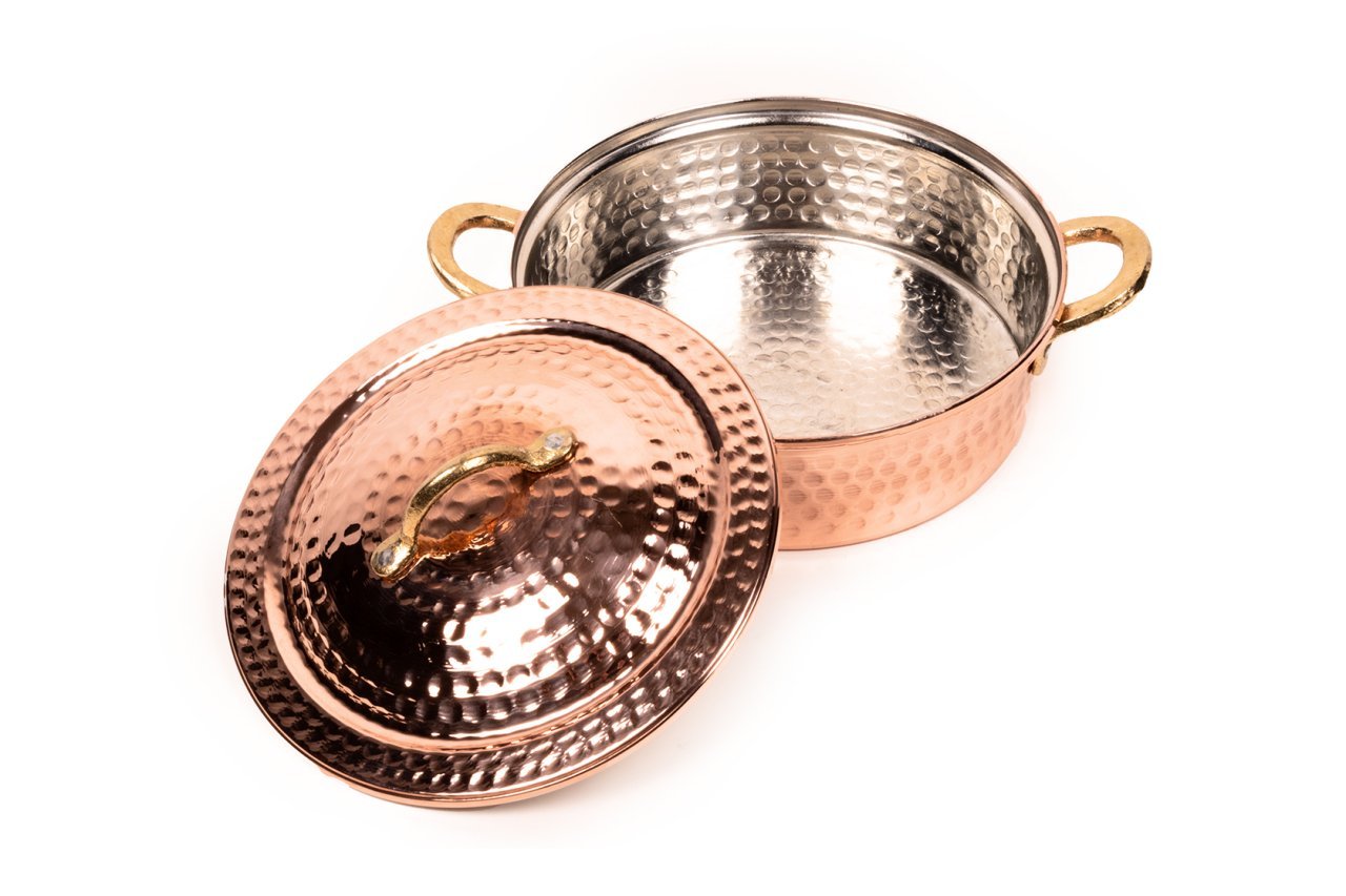 Handygoo Orta Boy Dövme Bakır Pilav Tenceresi, son derece modern fakat bir o kadar da geleneksel tasarımı ile göz dolduruyor. 25,5 cm çap ve 8 cm derinliği ile pilav, karnıyarık vb. yemeklerinizi bakır tencere lezzetinde pişirmek için son derece kullanışlıdır. Kapağındaki özel tasarımımız ile birlikte, kapak kenarları bakır tencere dışına damlatma yapmamaktadır. Günlük kullanımda güvenle kullanımınız için iç kısmı tamamen kalaylanmıştır. Ürün bakır kaplama değildir. Gerçek bakırdan elde şekil verilerek ve yine elde çekiç ile dövülerek üretilmiştir. Kalın bakırdan üretilen dövme bakır tencere kendi imalatımızdır. Mutfağınızda severek kullanabileceğiniz bakır pilav tenceresi, mutfağınızdaki diğer çelik, granit vb tencerelerinizi de dekoratif olarak tamamlayacaktır.
