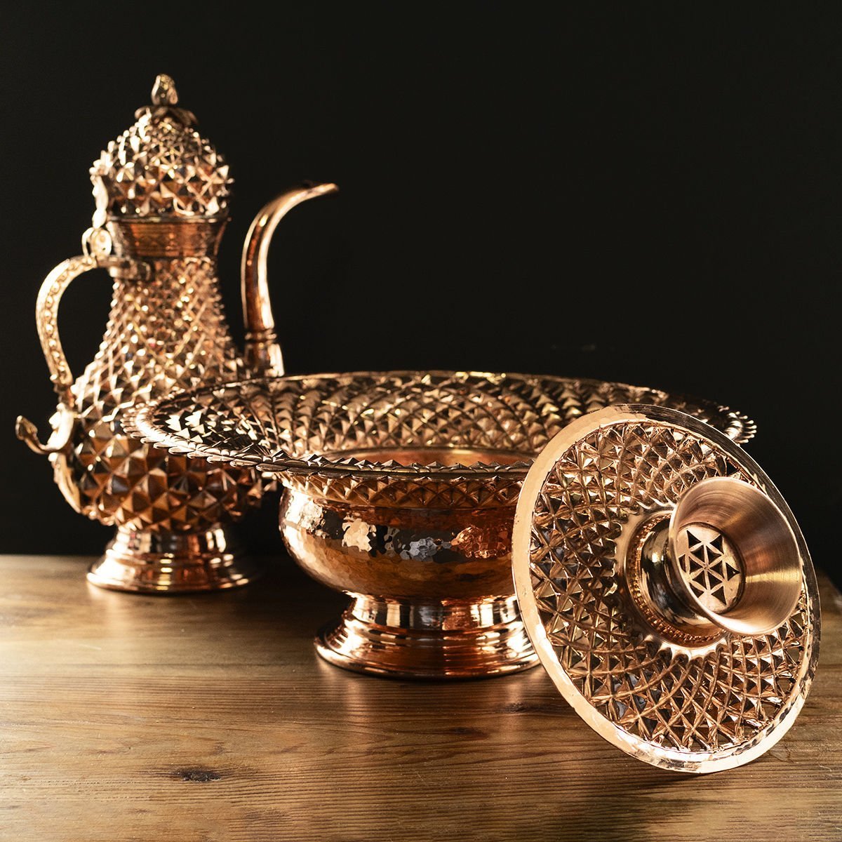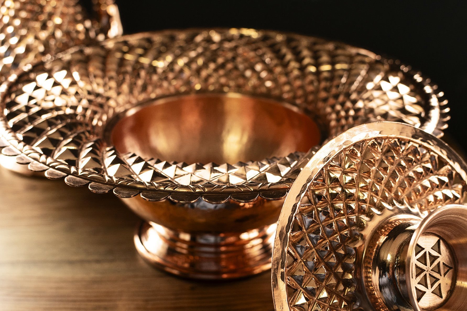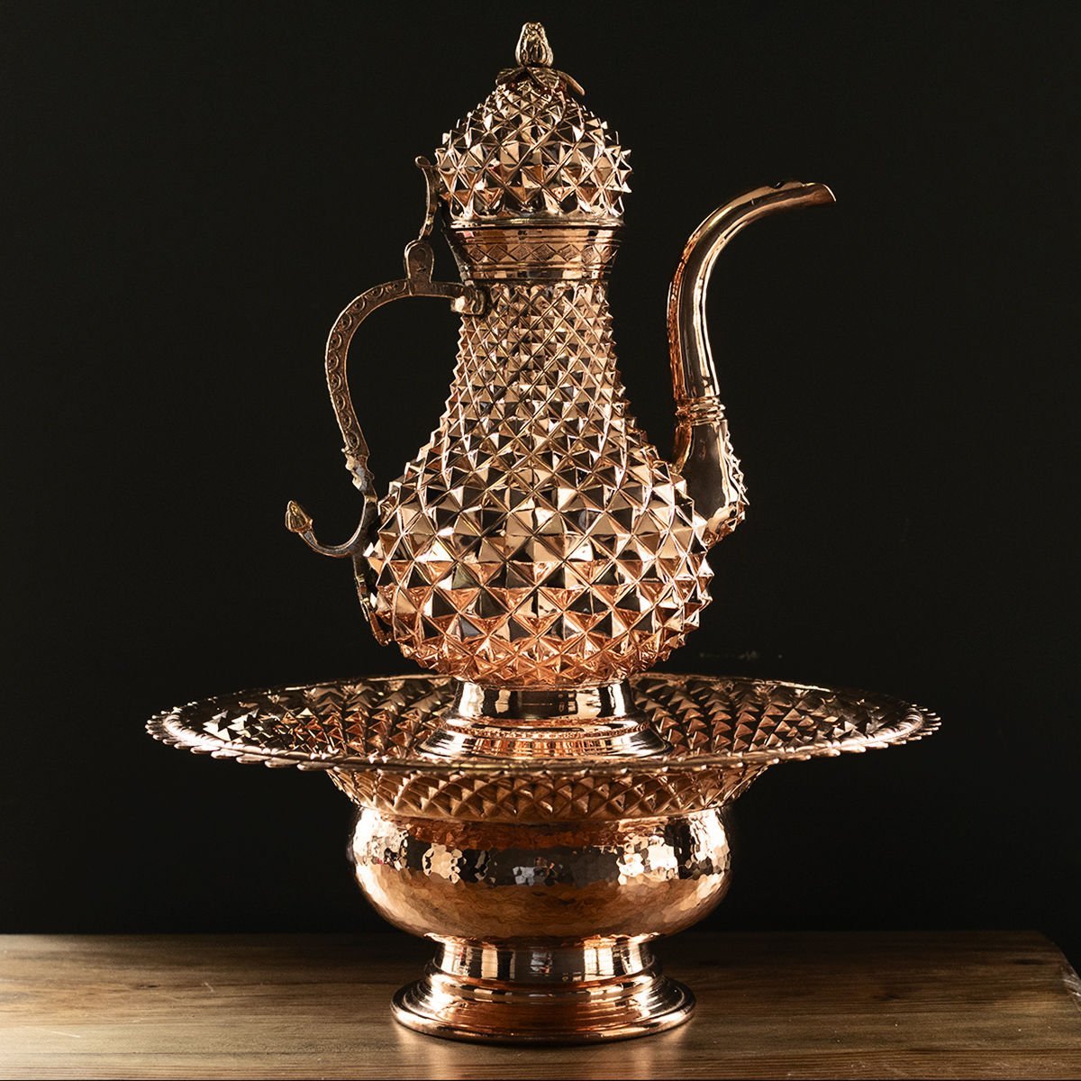 Handygoo Osmanlı Bakır El İbriği ve Leğeni, göz alıcı ihtişamı ile sizleri bekliyor. Tamamen el yapımı olan bakır el ibriği ve leğeni, çok özel bir işçiliğe sahiptir. Genel hatları ile üst kısımda ibriği ve alt kısımda ise leğen kısmı ile 2 parçadır. Üzerindeki piramit desenleri bakırın kızıl rengi ile birleşmiş ve muhteşem bir sanat eserine dönüşmüştür. Modelimizin leğen kısmı 33 cm çap ve 13 cm yüksekliğe sahip iken, ibrik yüksekliği 32 cm dir. Ürünümüzün toplam yüksekliği 45 cm dir. Bakır El İbriği ve Leğeni, %100 bakır olupkalın saçdan dövülmüştür. Her bir piramit deseni el işçiliğidir. Evinizde ve iş yerlerinizde muhteşem bir dekorasyon öğesi olacak olan modelimize ücretsiz kargo fırsatı ile sizlerde sahip olabilirsiniz.