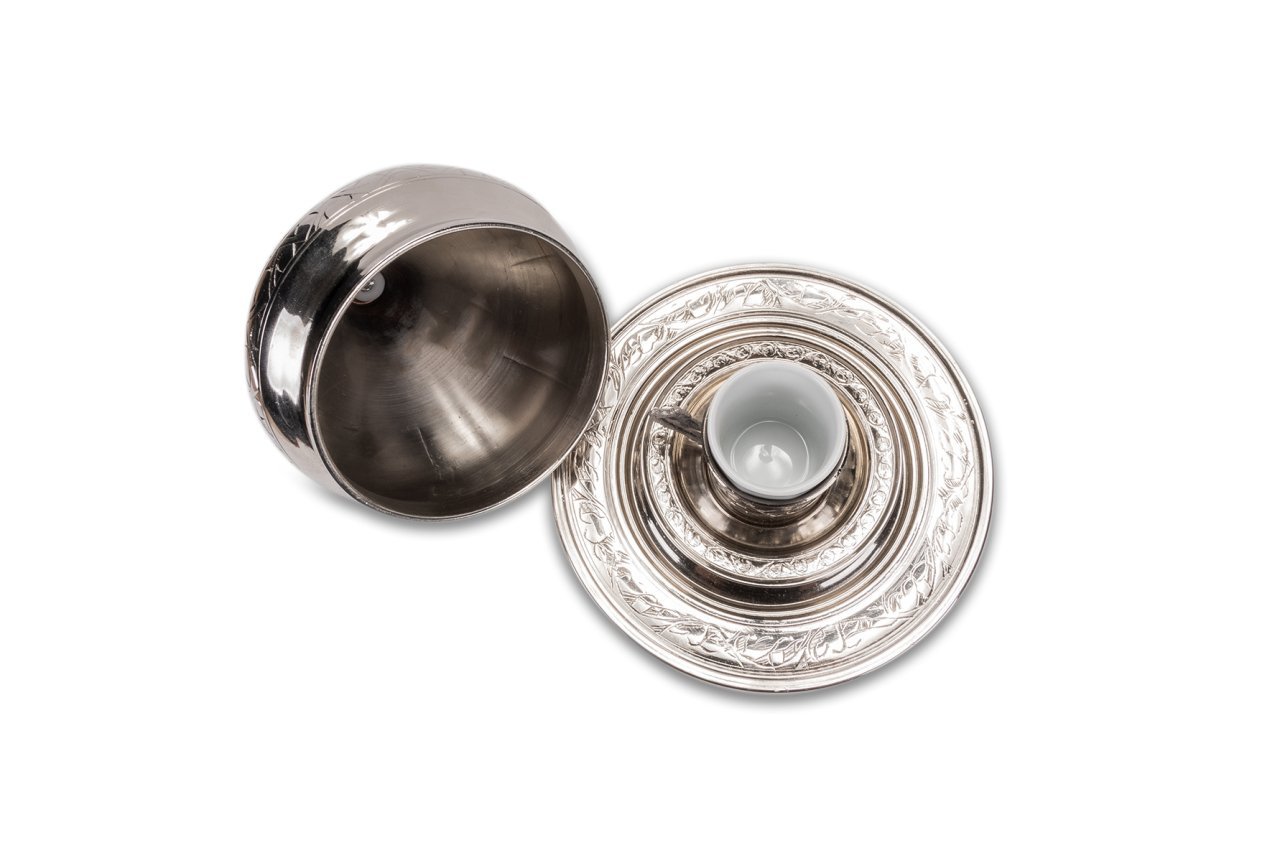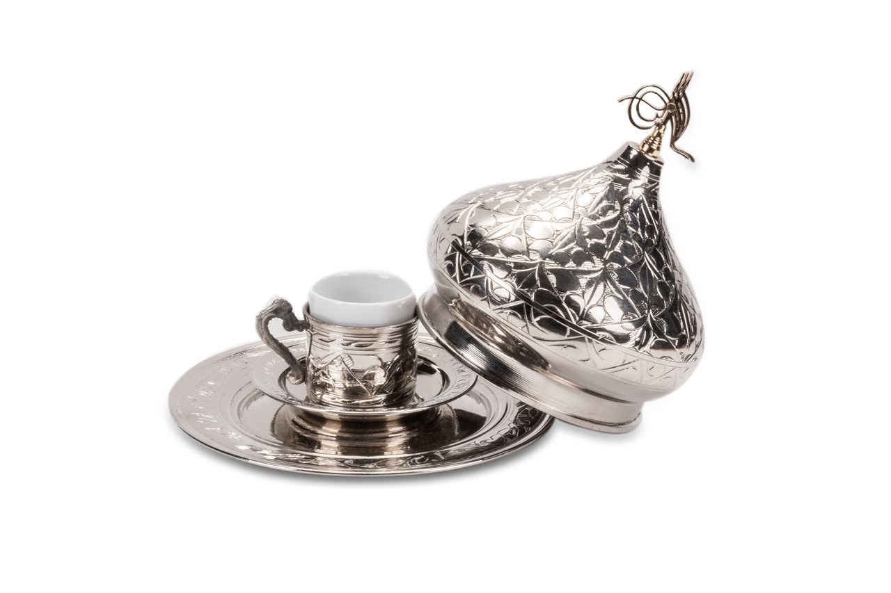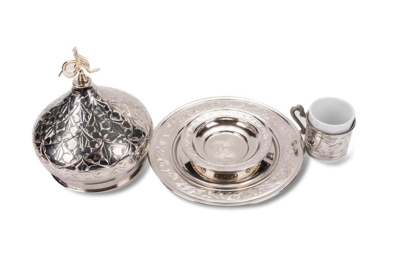 Handygoo Pasa Kahvelik Bakır Kahve Sunum Seti, günlük kullanıma dekoratif güzelliği ile damga vuruyor. Bakır kahve sunum seti, tek kişilik olup, ürün görsellerinde yer aldığı üzere bakır kahve fincan kaidesi ve tabağı , porselen kahve fincanı ve tümünü kapsayacak şekilde paşa kahveliği şeklinde set olarak satılmaktadır. Ürün çapı 18,5 cm iken, kapak çapı 12 cm dir. Ürünün toplam yüksekliği 18 cm dir. Ürün tamamen el işlemesi ve el yapımıdır. Nikelaj kaplaması ile parlak ve göz alıcıdır. Evinizde, iş yerinizde kullanmak isteyebileceğiniz ürün aynı zamanda sevdiklerinize hediyelik olarak da düşünebileceğiniz bir üründür.