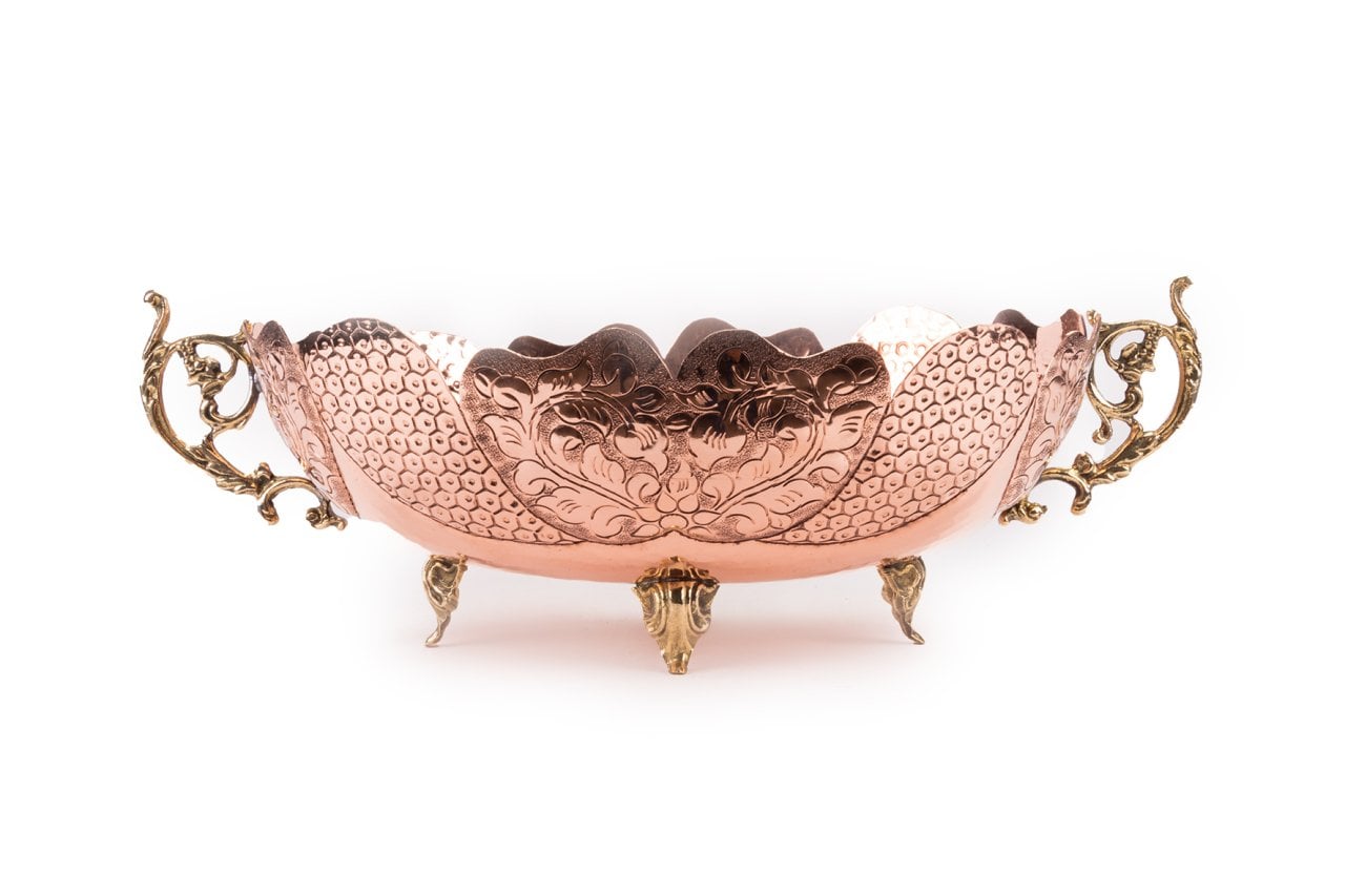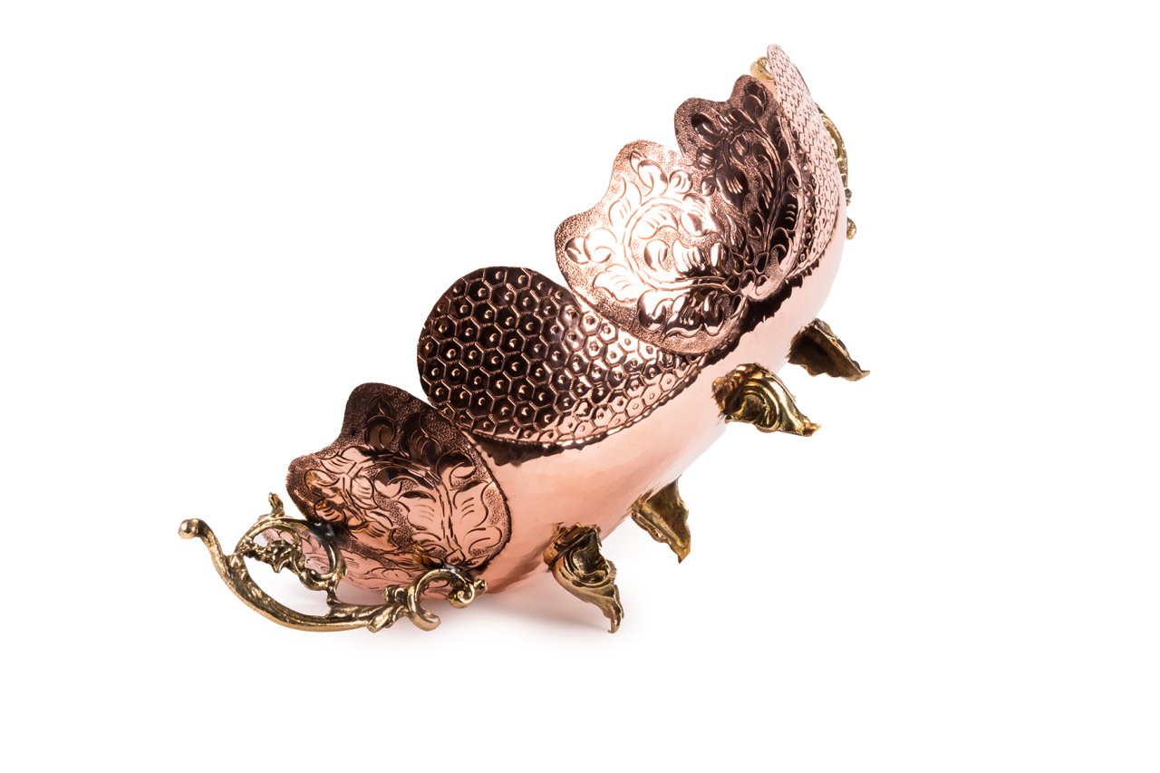 Handygoo Plus Kırmızı Bakır Gondol Tepsi, sunum ve servis modelleri içerisinde son derece özgün ve yaratıcı bir şekilde ön plana çıkıyor. Ürün kendi imalatımız olup kulpları ve ayakları hariç tamamı kalın bakırdan üretilmiştir. Bakır Gondol ürünümüzün kulpları ve ayakları döküm pirinçtir. Bakır gondol üzerinde farklı iki bakır tasarım metodu kullanılmıştır. Bakır gondol ürünümüzün dış yüzeyi tamamı bakır nakış ustalarımızın yaptığı karakteristik el işleme ve el dövmesi örnekleri ile kaplıdır. İç yüzey ise yine elde dövülerek şekillendirilmiştir. Bakır tepsi yada bakır gondol ürünümüzün yan duvarlarını süsleyen muntazam dalga şekilleri ise yine elde kesilerek hayat bulmuştur. İç yüzey kalaylıdır. Bakır gondol ürünümüzün sitemizde 4 farklı boy seçeneği ve ayrıca set olarak satışa sunulmuş olan seçeneği yer almaktadır. Ürünümüzün en ufak boyu 17 cm en, 24 cm boy ölçüsüne sahiptir. Kulptan kulba ölçüldüğünde 32 cm boy ölçüsüne sahip olan ürünümüzün yüksekliği 11 cm dir. Orta boy ise, 21 cm en, 28 cm boy ve kulptan kulpa 36 cm dir. Yüksekliği 12 cm dir. En büyük boy bakır ürünümüz ise 24 cm en, 33 cm boy ölçüsündedir. Yüksekliği 13 cm olan ürünümüzün kulptan kulpa boy ölçüsü 41 cm dir. Battal boyun ise 28,5 cm en, 12,5 yükseklik ve 46 cm lik boy ölçüsü yer almaktadır. Ürünümüz ev ve iş yerlerinizin dekorasyonuna, servis ve sunumlarınıza bambaşka bir güzellik katacaktır. Tüm ürünlerimizde olduğu gibi ücretsiz kargo fırsatı ile sahip olabileceğiniz ürünümüzü güvenli alış veriş ile satın alabilirsiniz.