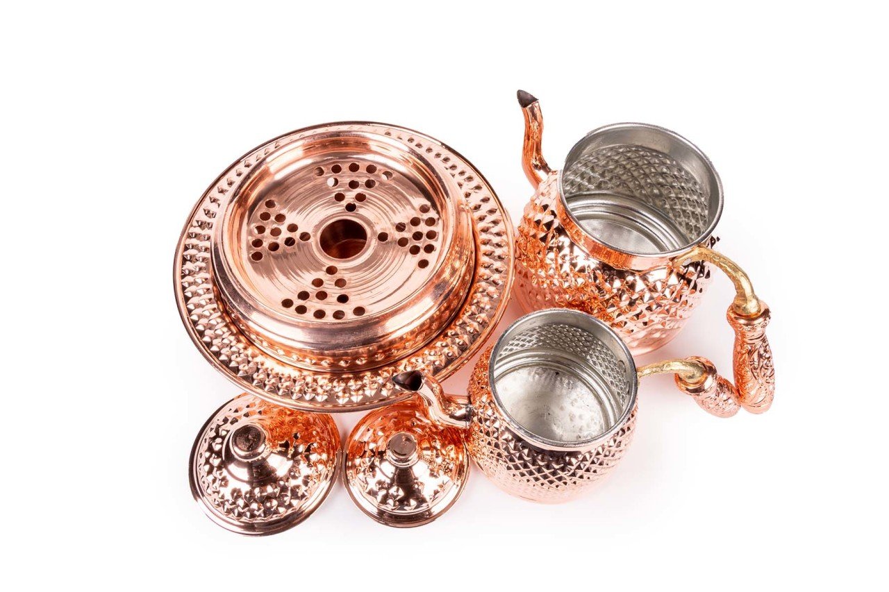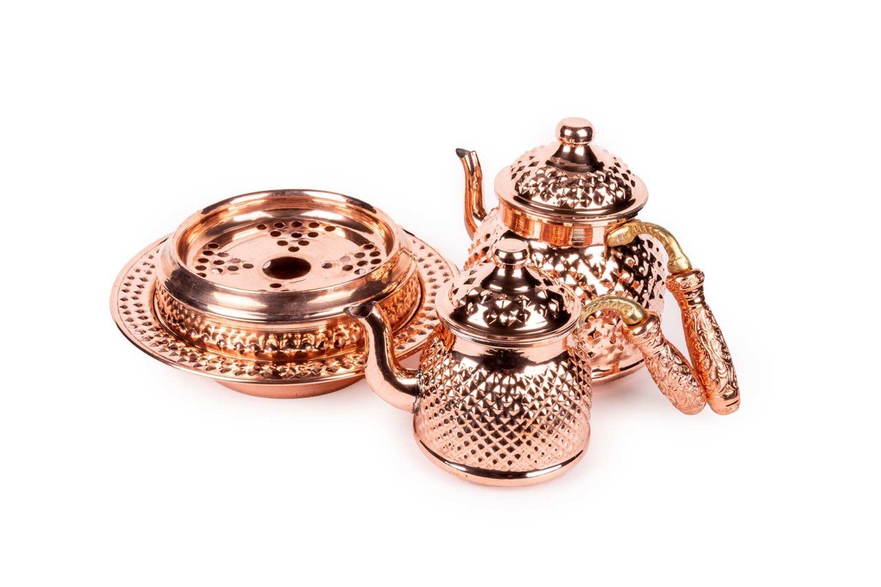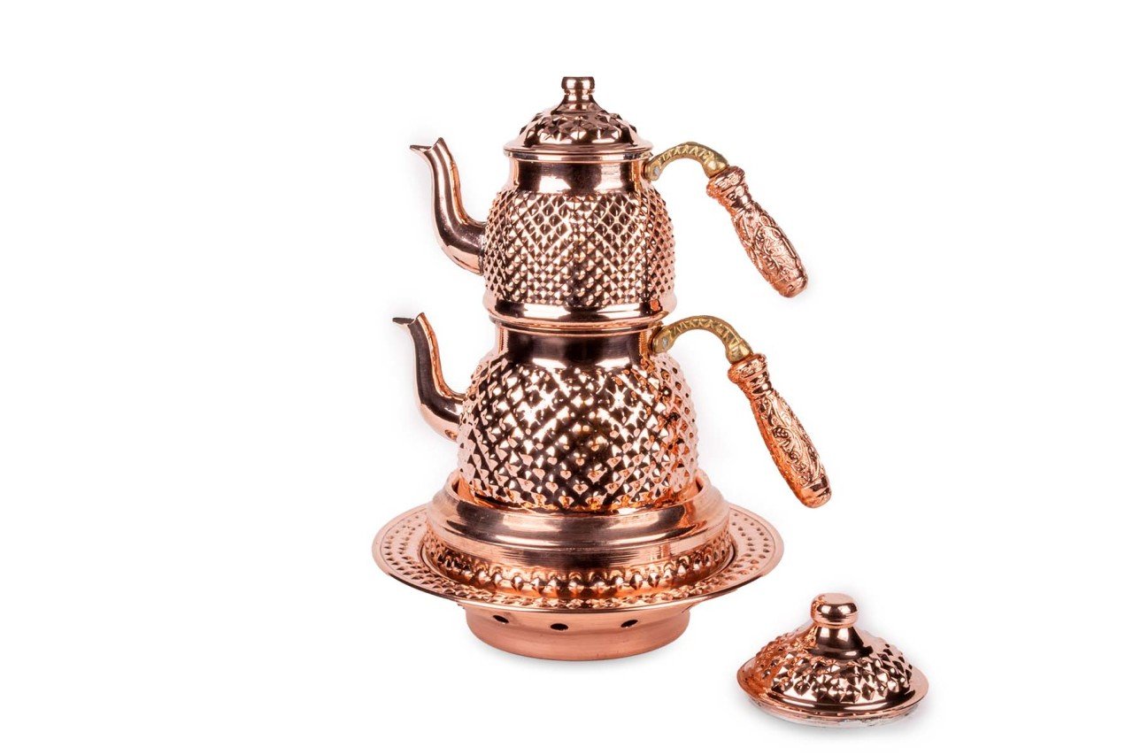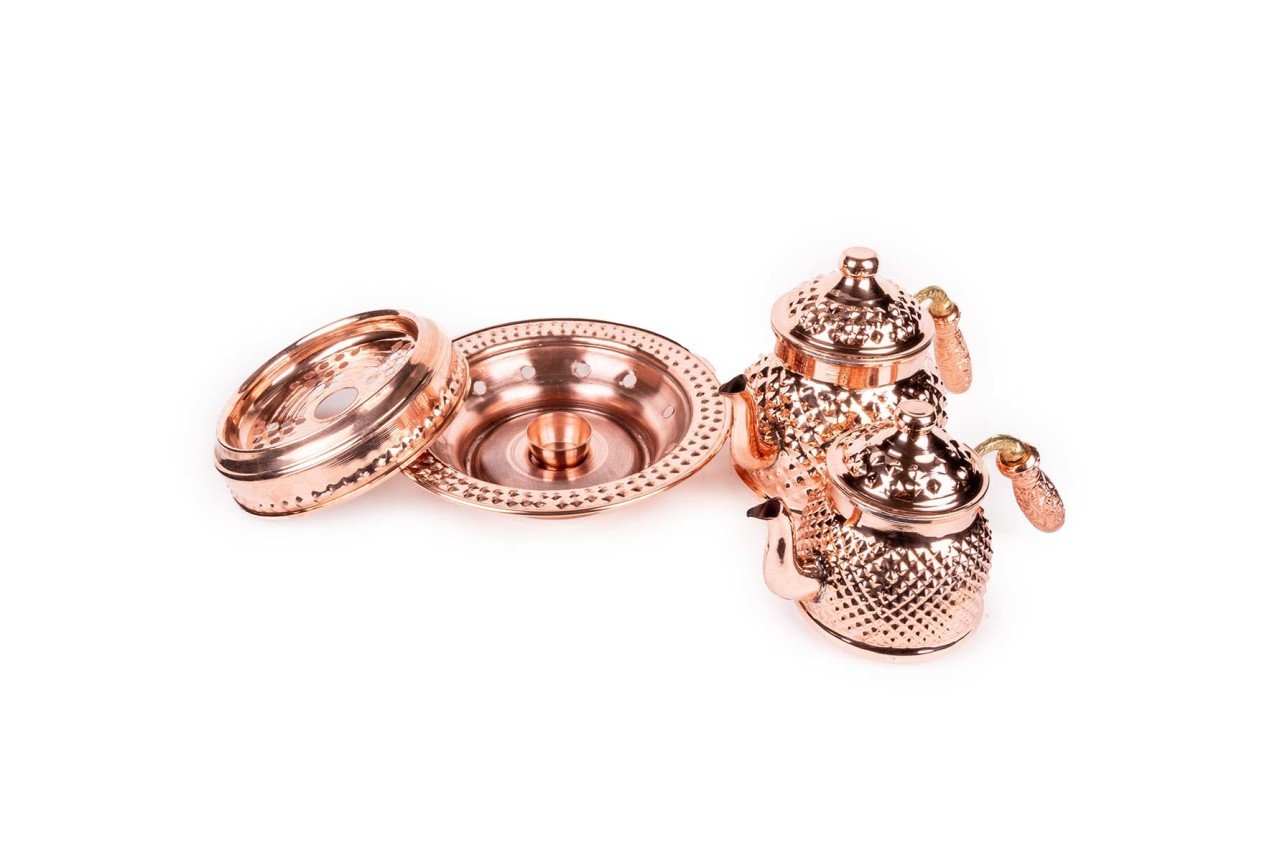 Handygoo Red Keops Bakır Çaydanlık ve Balkon Sefası, bakır çaydanlık modellerinde yeni bir nefes, farklı bir tarz. Lezzetli çaylar demlemeniz için tasarlandı. Kahvaltıda, ara öğünlerde, yemekten sonra, tatlının yanında...Hiç şüphesiz çay içmenin yeri ve zamanı yoktur. Bu doğrultuda da çay, pek çok insan için önem verilen içeceklerin başında gelir. Gün içerisinde kimi zaman bir bardak, kimi zaman ise bir demlik çay içilebilmektedir. Ortak bir çay demleme yöntemi bulunmamaktadır ancak bilindiği üzere bakır ürünlerde demlenen, servis edilen her içeceğin lezzetinin arttığı bir gerçektir. Çayınızı demlerken, bu ürün, şık ve otantik görüntüsü ile yine fark yaratmanızı sağlayacaktır. Ürün bakır çaydanlık ve kendisi ile takım balkon sefası ile birlikte satılmaktadır. Bakır çaydanlık iki ana kısımdan oluşmaktadır. Her iki kısım üzerinde ham bakır üzerine ustaca ve sabırla işlenmiş, piramit şekilleri yer almaktadır. Her iki parçanın da birbirinden bağımsız kapakları yer almaktadır. Kulplar son derece şık ve göz alıcıdır. Bakır çaydanlık, evinize, ofisinize yada bulunduğunuz herhangi bir mekana zerafet ve şıklık getirecektir. Kendiniz yada hediye ettiğiniz sevdikleriniz çaylarını iki kat keyif ile yudumlayacaklardır. Çaydanlık su haznesi 1,8 litre su almaktadır. Üst demlik ise 0,8 lt su almaktadır. Kalın bakırdan üretilmiştir ve ağırlığı 1 kg (+50)(-50) dır. Balkon sefası iç çapı 16 cm iken, dış çapı 24 cm dir. Bakır balkon sefası yüksekliği 11 cm dir. Bakır balkon sefası, özellikle çay servisiniz esnasında çaydanlıklarınızın ısısını kaybetmemesi için tasarlandı. Özellikle bakır çaydanlık ürünleri ile bir bütün oluştururken dilerseniz porselen yada emaye demlik ve çaydanlıklarınız ile de rahatlıkla kullanabilirsiniz. Altında mumluk alanı yer alan ürün sayesinde tea light mumlarınız yada jel ile size hem romantik bir ortam sağlayacak, hem de enfes çay ve benzeri içecek ikramlarınız her daim sıcak kalacak.
