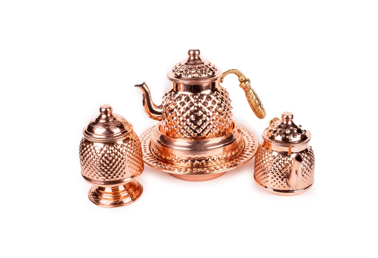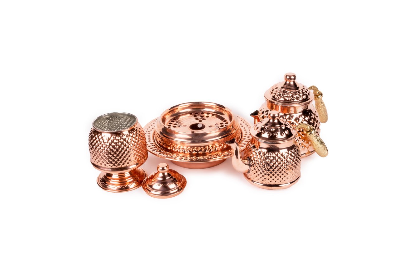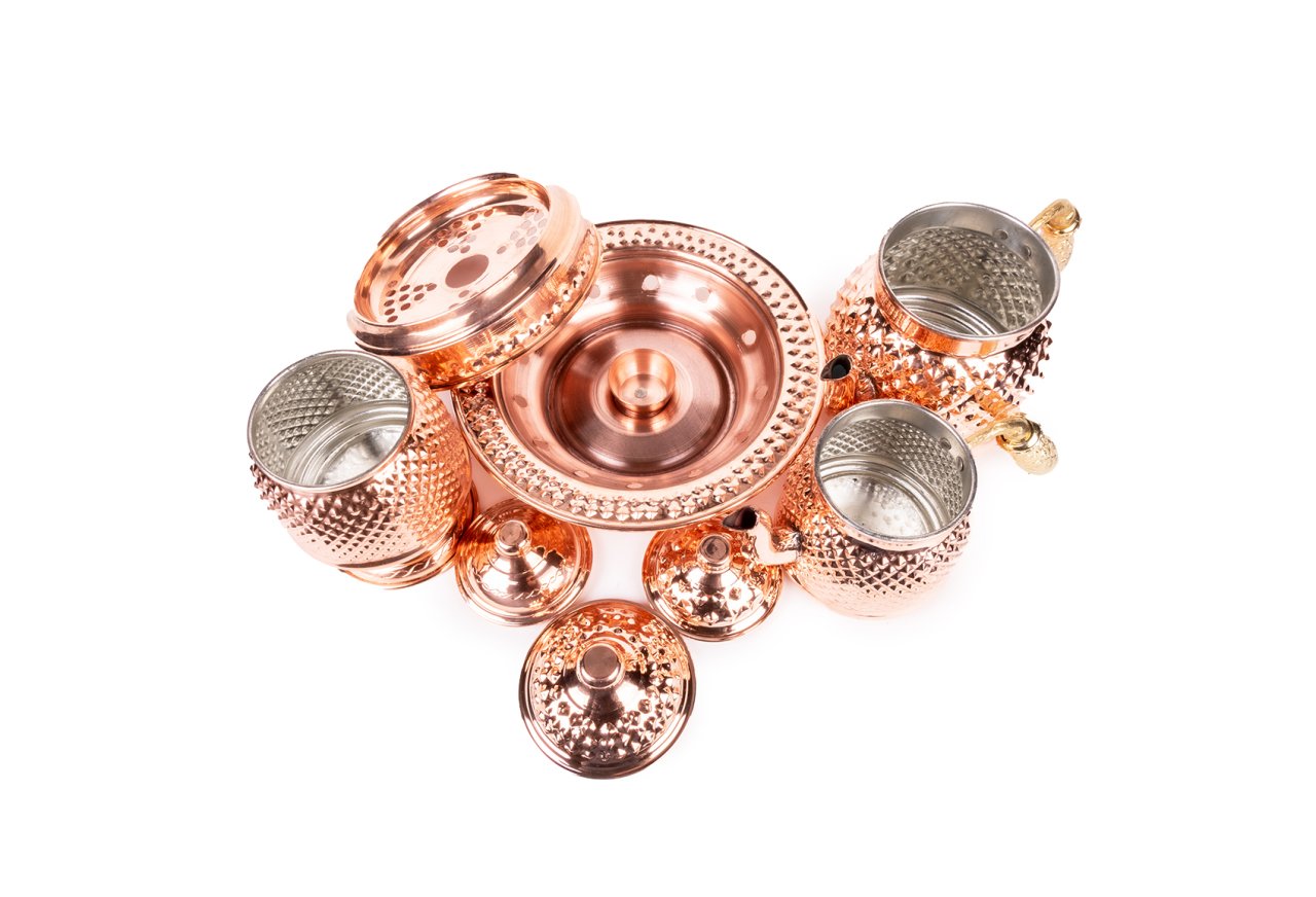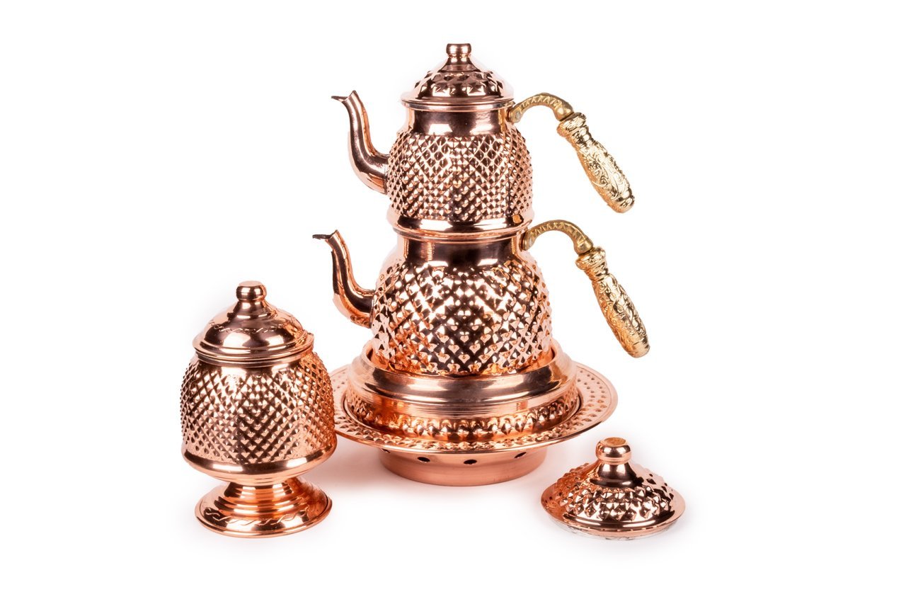 Handygoo Sarı Saplı Red Keops Bakır Çaydanlık ve Bakır Şekerlik Seti, bakır çaydanlık ve çay servisi setlerinde yepyeni bir model ve tarz olarak karşınızda. Ürün, bakır çaydanlık, bakır balkon sefası ve bakır şekerlik olmak üzere 3 parça set olarak satılmaktadır. Dilerseniz setin tüm parçalarını bağımsız olarak da sitemizden satın alabilirsiniz. Çayınızı demlerken ve servis ederken, bu ürün, şık ve otantik görüntüsü ile yine fark yaratmanızı sağlayacaktır. Bakır çaydanlık iki ana kısımdan oluşmaktadır. Her iki kısım üzerinde ham bakır üzerine ustaca ve sabırla işlenmiş, piramit şekilleri yer almaktadır. Her iki parçanın da birbirinden bağımsız kapakları yer almaktadır. Kulplar son derece şık ve göz alıcıdır. Bakır çaydanlık, evinize, ofisinize yada bulunduğunuz herhangi bir mekana zerafet ve şıklık getirecektir. Kendiniz yada hediye ettiğiniz sevdikleriniz çaylarını iki kat keyif ile yudumlayacaklardır. Çaydanlık su haznesi 1,8 litre su almaktadır. Üst demlik ise 0,8 lt su almaktadır. Kalın bakırdan üretilmiştir ve ağırlığı 1 kg (+50)(-50) dır. Balkon sefası iç çapı 16 cm iken, dış çapı 24 cm dir. Bakır balkon sefası yüksekliği 11 cm dir. Bakır balkon sefası, özellikle çay servisiniz esnasında çaydanlıklarınızın ısısını kaybetmemesi için tasarlandı. Özellikle bakır çaydanlık ürünleri ile bir bütün oluştururken dilerseniz porselen yada emaye demlik ve çaydanlıklarınız ile de rahatlıkla kullanabilirsiniz. Altında mumluk alanı yer alan ürün sayesinde tea light mumlarınız yada jel ile size hem romantik bir ortam sağlayacak, hem de enfes çay ve benzeri içecek ikramlarınız her daim sıcak kalacak. Bakır şekerlik yine özel tasarımdır. Ürünün ağız çapı 8,5 cm, taban çapı 12 cm dir. Ürün yüksekliği 17 cm dir. Şekerlik ayaklığının çapı ise 10 cm dir. Ürünün içi kalaylanmıştır. Hem dekoratif hem de şık görüntüsü ile evinizde ve iş yerinizde günlük olarak kullanmaktan büyük zevk duyacaksınız.
