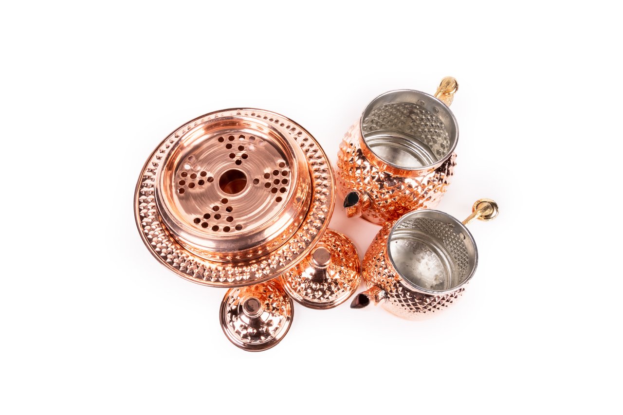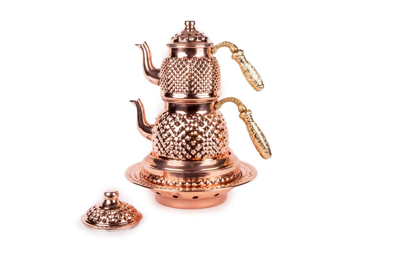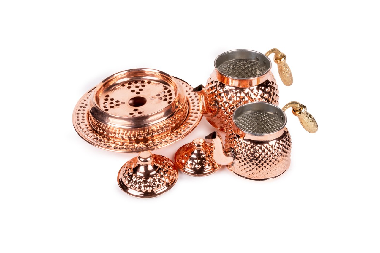 Handygoo Sarı Saplı Red Keops Bakır Çaydanlık ve Balkon Sefası, bakır çaydanlık modellerinde yeni bir nefes, farklı bir tarz. Lezzetli çaylar demlemeniz için tasarlandı. Kahvaltıda, ara öğünlerde, yemekten sonra, tatlının yanında...Hiç şüphesiz çay içmenin yeri ve zamanı yoktur. Bu doğrultuda da çay, pek çok insan için önem verilen içeceklerin başında gelir. Gün içerisinde kimi zaman bir bardak, kimi zaman ise bir demlik çay içilebilmektedir. Ortak bir çay demleme yöntemi bulunmamaktadır ancak bilindiği üzere bakır ürünlerde demlenen, servis edilen her içeceğin lezzetinin arttığı bir gerçektir. Çayınızı demlerken, bu ürün, şık ve otantik görüntüsü ile yine fark yaratmanızı sağlayacaktır. Ürün bakır çaydanlık ve kendisi ile takım balkon sefası ile birlikte satılmaktadır. Bakır çaydanlık iki ana kısımdan oluşmaktadır. Her iki kısım üzerinde ham bakır üzerine ustaca ve sabırla işlenmiş, piramit şekilleri yer almaktadır. Her iki parçanın da birbirinden bağımsız kapakları yer almaktadır. Kulplar son derece şık ve göz alıcıdır. Bakır çaydanlık, evinize, ofisinize yada bulunduğunuz herhangi bir mekana zerafet ve şıklık getirecektir. Kendiniz yada hediye ettiğiniz sevdikleriniz çaylarını iki kat keyif ile yudumlayacaklardır. Çaydanlık su haznesi 1,8 litre su almaktadır. Üst demlik ise 0,8 lt su almaktadır. Kalın bakırdan üretilmiştir ve ağırlığı 1 kg (+50)(-50) dır. Balkon sefası iç çapı 16 cm iken, dış çapı 24 cm dir. Bakır balkon sefası yüksekliği 11 cm dir. Bakır balkon sefası, özellikle çay servisiniz esnasında çaydanlıklarınızın ısısını kaybetmemesi için tasarlandı. Özellikle bakır çaydanlık ürünleri ile bir bütün oluştururken dilerseniz porselen yada emaye demlik ve çaydanlıklarınız ile de rahatlıkla kullanabilirsiniz. Altında mumluk alanı yer alan ürün sayesinde tea light mumlarınız yada jel ile size hem romantik bir ortam sağlayacak, hem de enfes çay ve benzeri içecek ikramlarınız her daim sıcak kalacak.