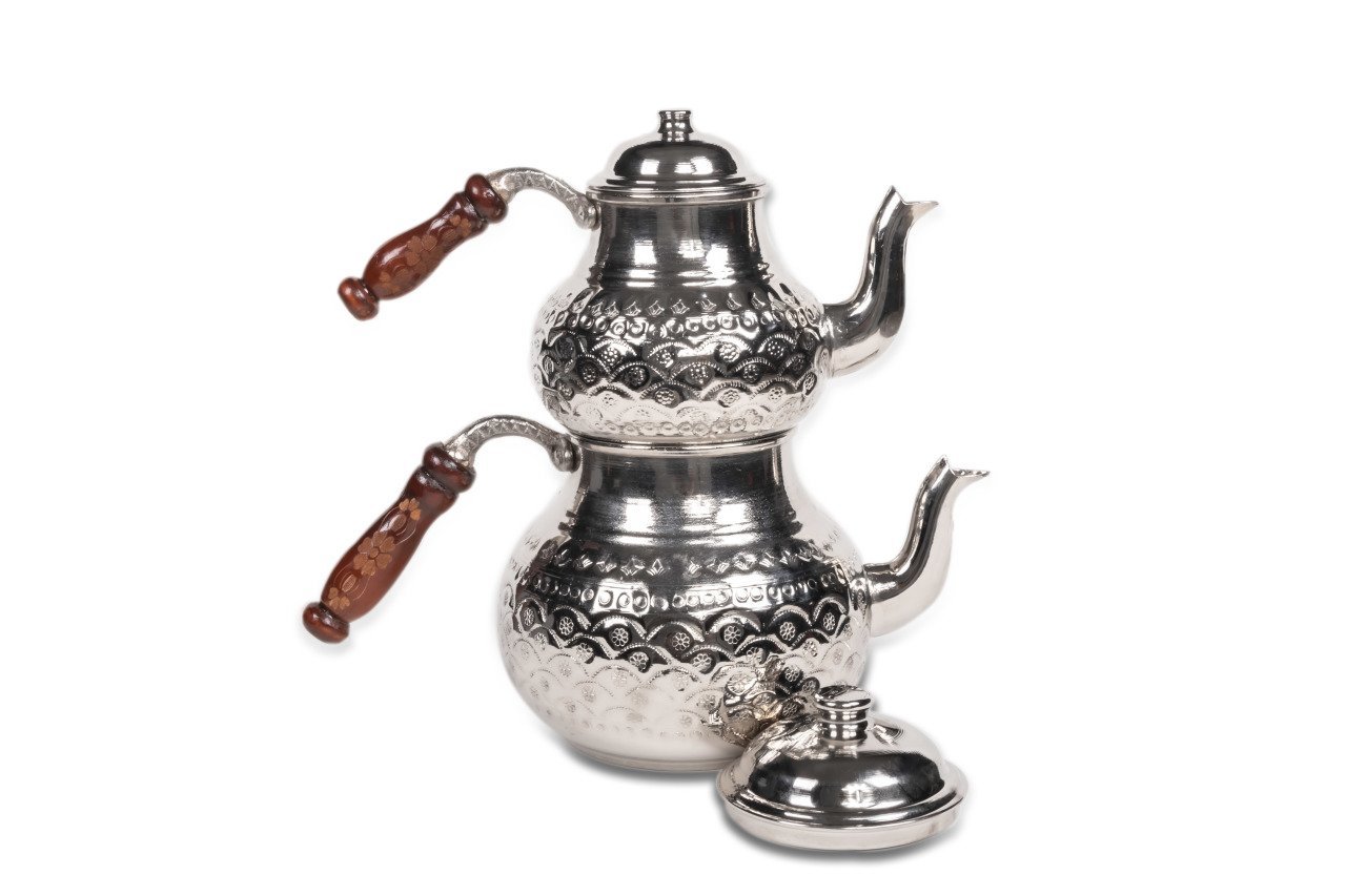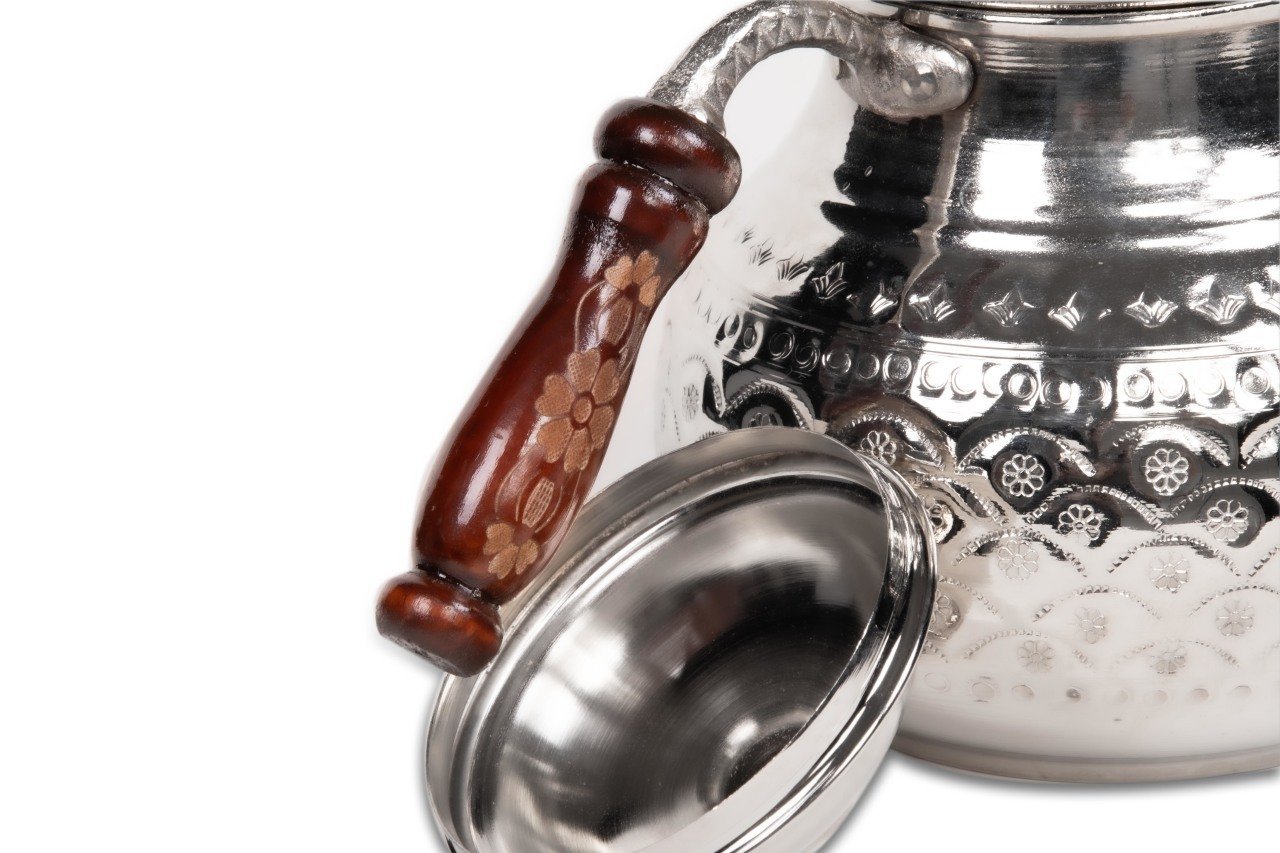 Shiny El Yapımı Dövme Bakır Çaydanlık, Gaziantep dövme ve el işlemesi sanatının tüm karakteristik özelliklerini yansıtmaktadır. Alt demlik 1,7 lt, ist demlik ise 1,5 lt hacminde olup, ürün tamamen el yapımıdır. Kullanım kolaylığı açısından kulpları ahşap olup üzerlerinde çok zarif motifler bulundurmaktadır. Çay demleme alışkanlıklarınızı bambaşka bir boyuta taşıyacak olan ürün içi kalaylanmıştır. Doğru kullanım koşullarında uzun zaman boyunca kullanımız için tasarlanan bakır çaydanlık sevdiklerinize hediye de edebileceğiniz eşsiz bir ürün olarak karşınızda yer almaktadır.