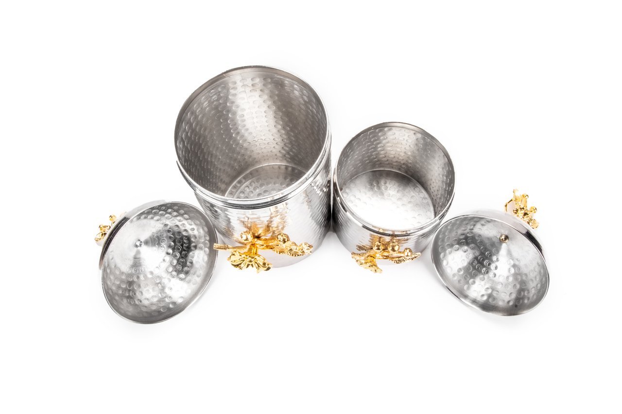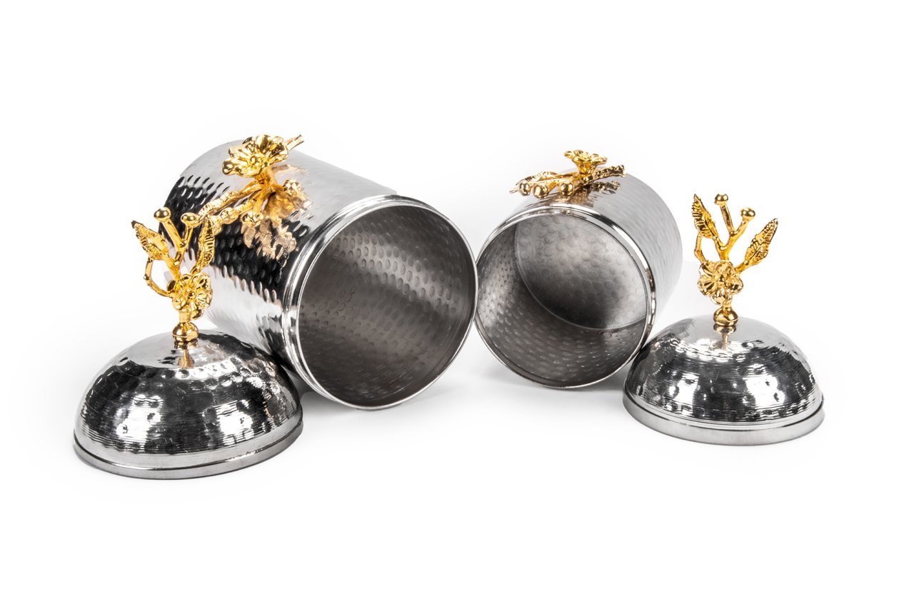 Handygoo Silver Spice Box Bakır Baharatlık Seti, 2 farklı boyu ile baharat ve benzeri saklama ihtiyaçlarınıza tüm güzelliği ile yanıt veriyor. Dövme bakırdan üretilmiş olup, çekiç darbeleri ile şekillendirilmiştir. Büyük boy olanının çapı 10 cm ve kapaklı yüksekliği 28 cm dir. Ürünün ufak parçası ise 9 cm çapa ve kapaklı 20 cm yüksekliğe sahiptir. İçleri özel olarak kalaylanmış olup göz alıcıdır. GÜnlük kullanıma son derece uygundur.