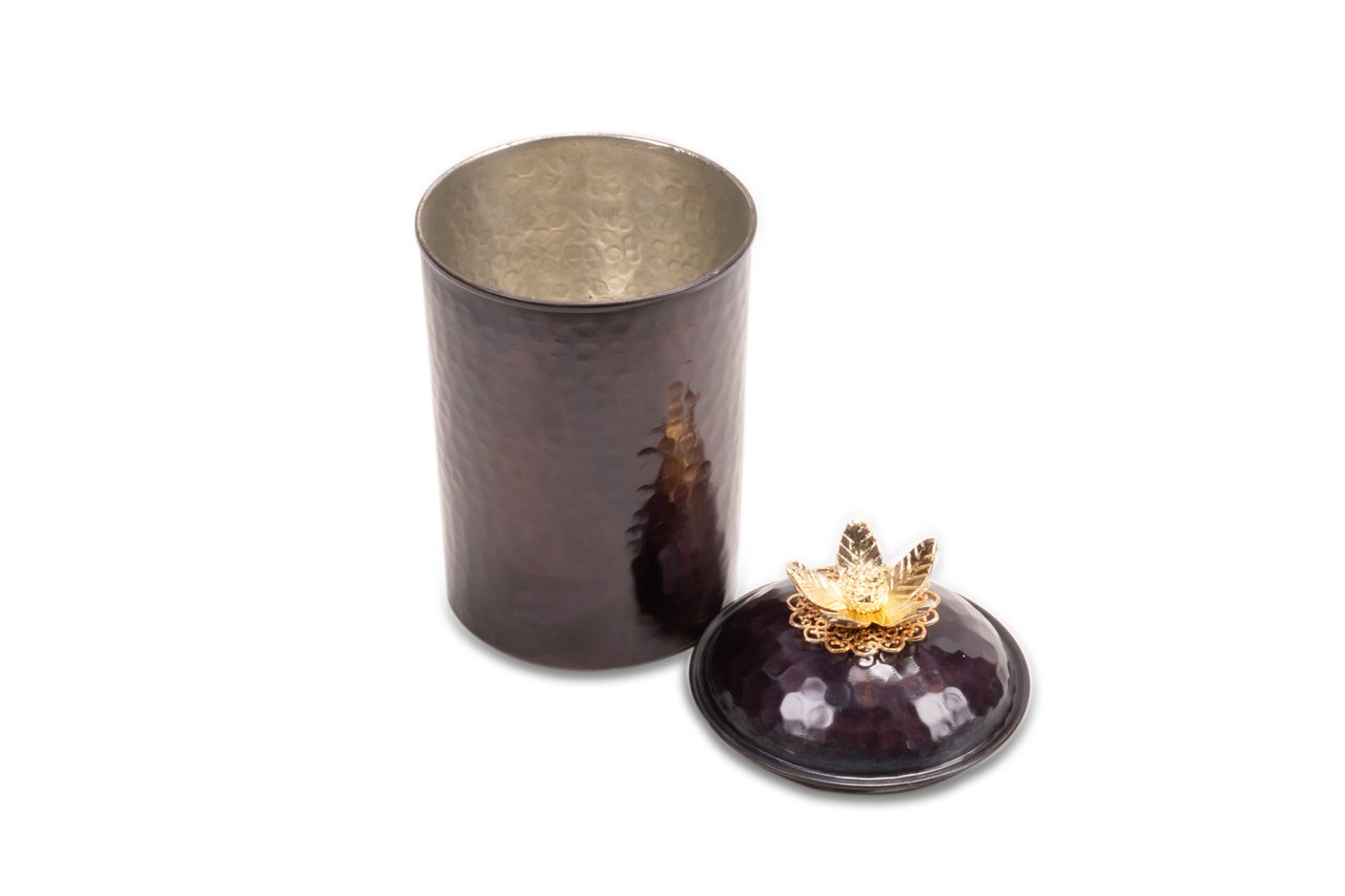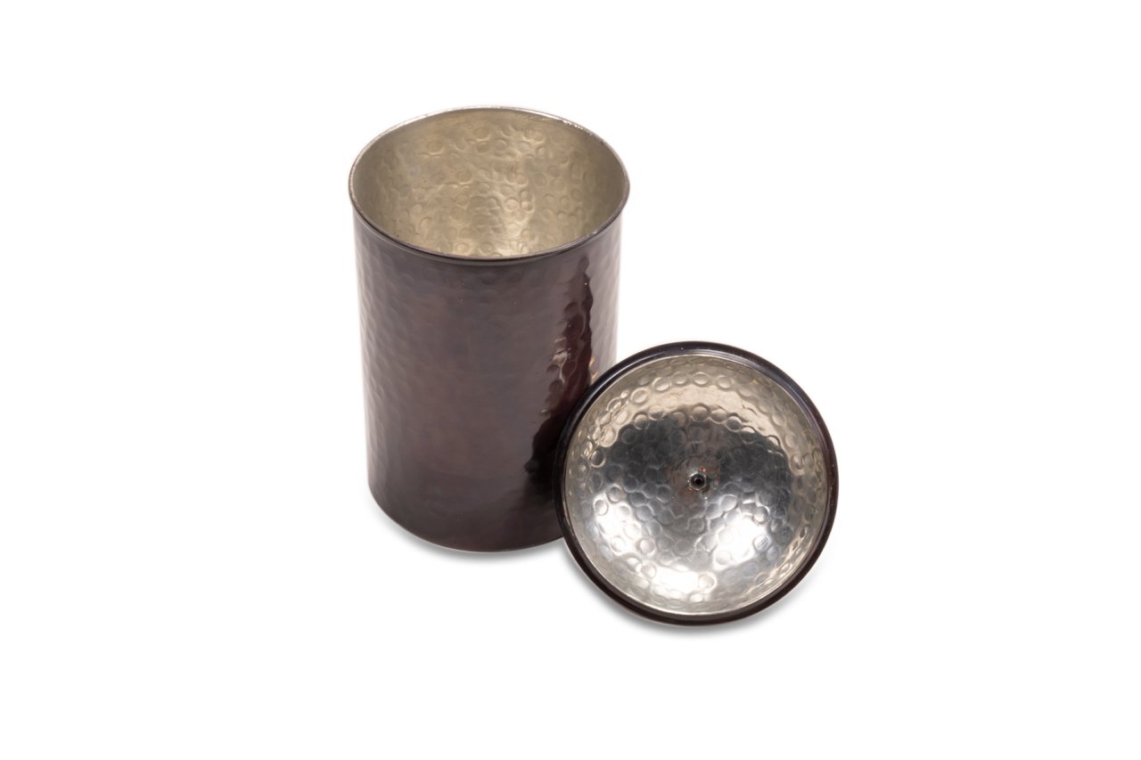 Handygoo Spice Box Bakır Baharatlık, baharat ve benzeri saklama ihtiyaçlarınıza tüm güzelliği ile yanıt veriyor. Dövme bakırdan üretilmiş olup, çekiç darbeleri ile şekillendirilmiştir. Ürün 10 cm çap ve 13 cm yüksekliğe sahiptir. Rengi özel olarak tasarlanmış olup içi kalay kaplıdır. Günlük kullanıma son derece uygundur.