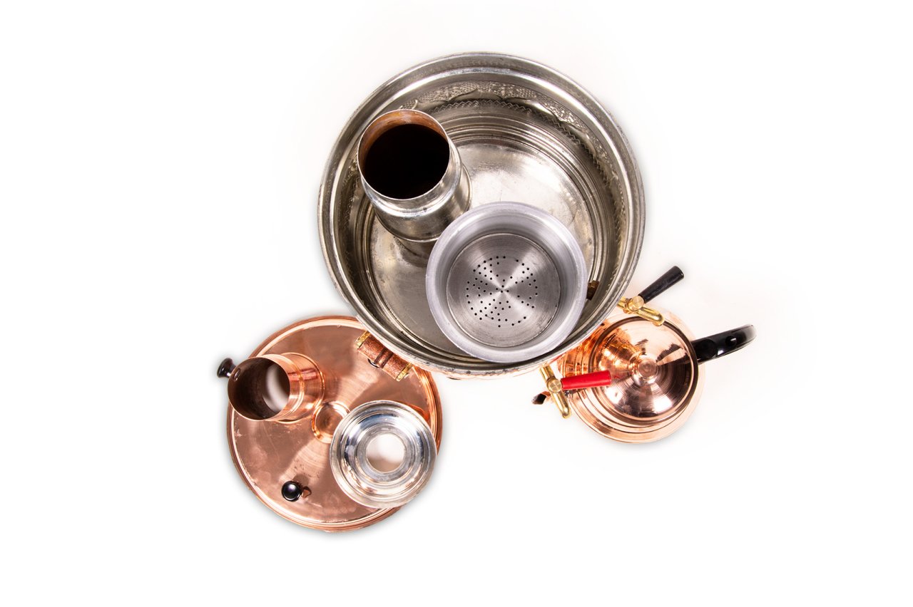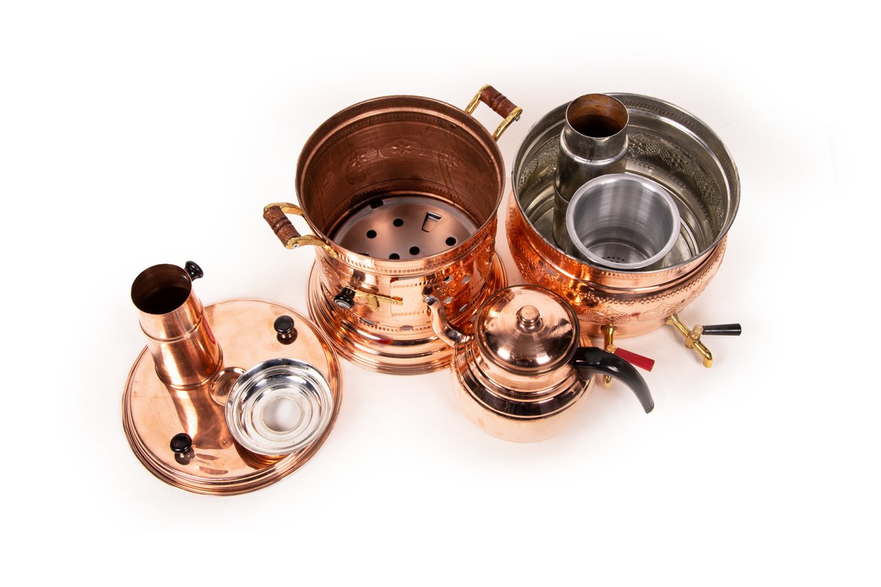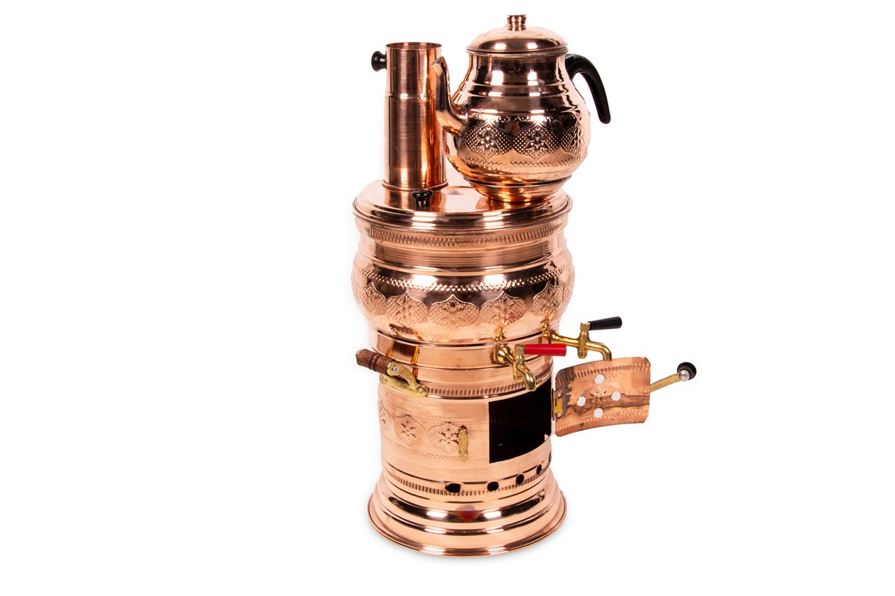 Handygoo Tea Love Bakır Semaver, çay demlemek isteyebileceğiniz her yerde zevkle kullanabileceğiniz bakır semaver modelimizdir. Hem aileniz hem de sevdikleriniz ile birlikte, odun ateşi ve bakır semaver ile demleyeceğiniz lezzetli çayları servis etmek ve içmek son derece hoşunuza gidecek. Bakır Semaver modelimiz çift haznelidir. Gövde içerisinde kaynamış su ve çay haznesi yer almaktadır. Bu haznelere bağlı iki adet musluğu yer alan ürünümüzde, musluklardan birini kaynamış su, diğerini ise hazne içindeki demlenmiş çayınızı servis etmek için kullanabilirsiniz. Daha uzun süreli çay keyfiniz için bakır semaverimiz üzerinde, gövde içerisinde yer alan çay haznesine ilave olarak bir demlik de yer almaktadır. Gövde içerisindeki çay haznesi bittiğinde, ilave demliğiniz ile çay keyfinize kesintisiz devam edebilirsiniz. Ürünün su haznesi 5,2 LT dir. Çay haznesi ve ilave demliği ile birlikte toplam hacmi 7 LT dir. Ürünün çapı 30 cm, baca borusu ve demliği ile birlikte yüksekliği ise 60 cm dir. Ürünümüz odun ateşi ile su kaynakmakda ve çay demlemektedir. Odun ateşi ile ürünün en alt haznesini kullanabilirsiniz. Kalın bakırdan üretilmiş olan ürünün iç kısmı güvenle kullanımınız için kalaylanmıştır. Aynı şekilde ilave demliğinizin de içi kalaylıdır. Ürünümüzü hem kendiniz hem de hediyelik olarak sitemizden tüm kredi kartlarına tek çekim veya taksitli olarak satın alabilirsiniz.