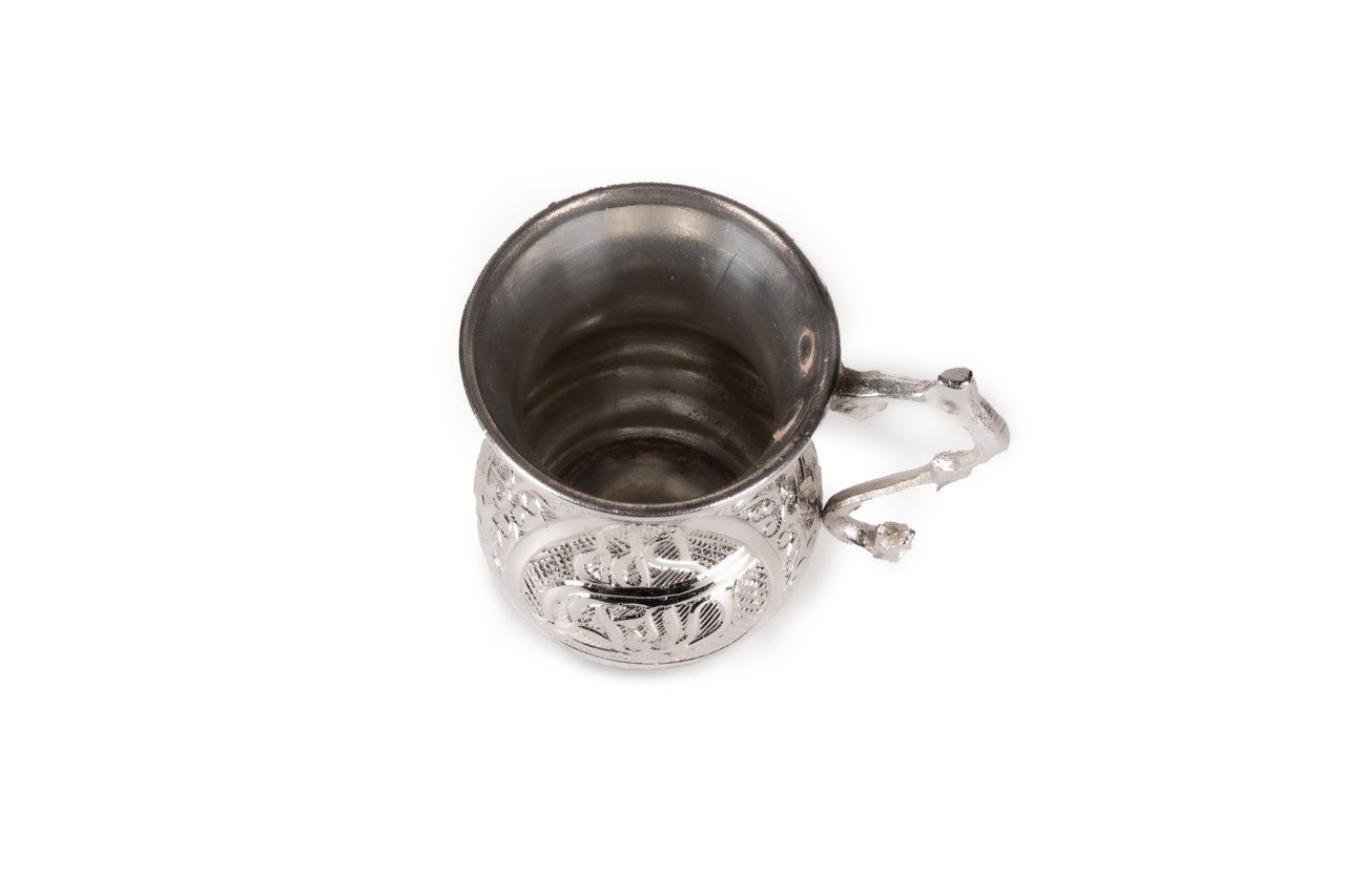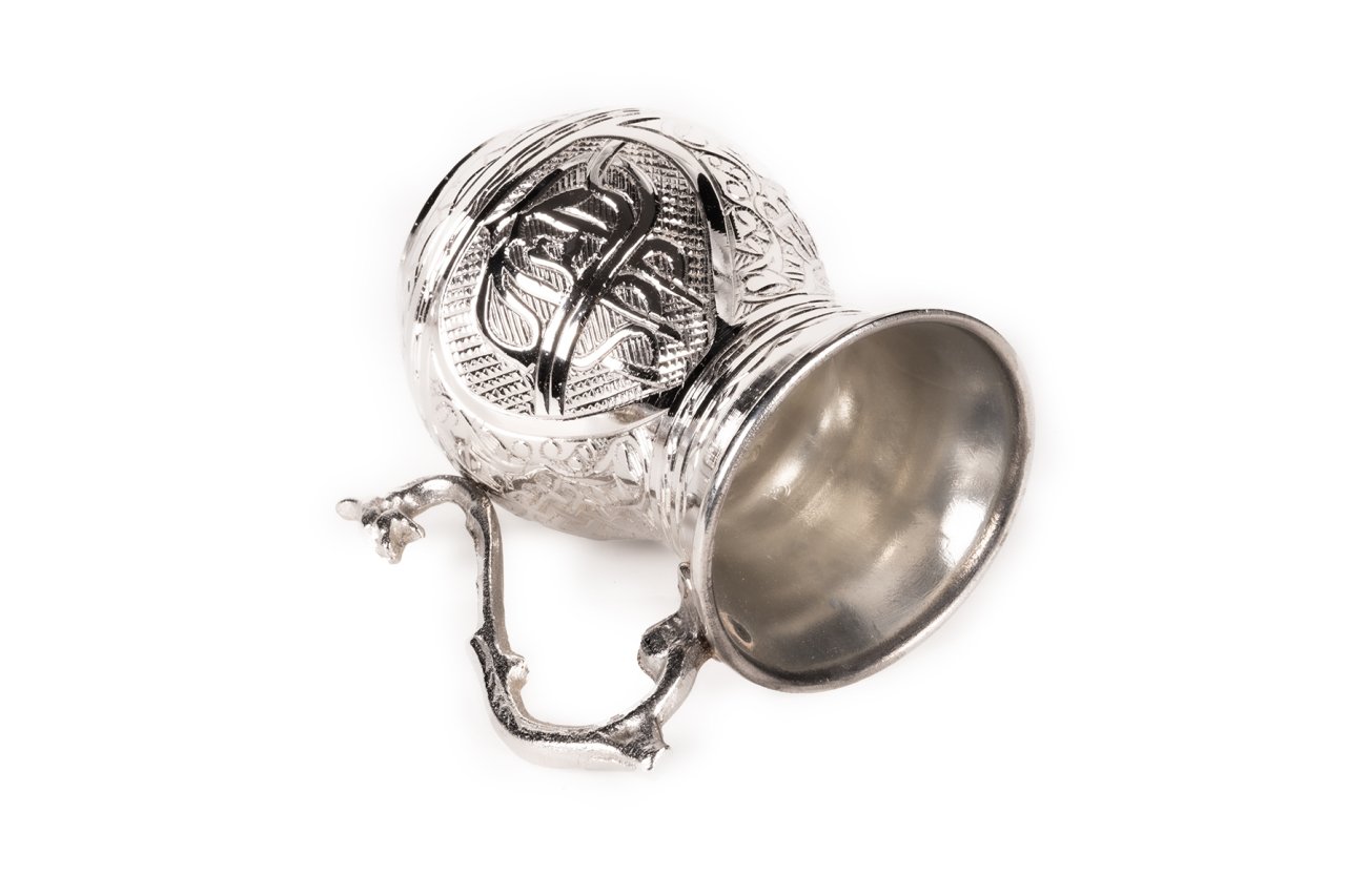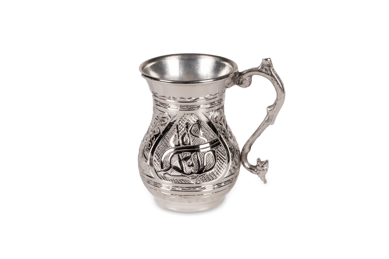 Handygoo Tuğra İşlemeli Nikelajlı Bakır Kupa, el yapımı ve el işlemesidir. Üzerinde ağır işlemeli tuğra deseni mevcuttur. 7,2 cm çapa ve 11 cm yüksekliğe sahiptir. Kulptan çapı ise 11 cm dir. Kalın bakırdan üretilmiş olup kendi imalatımızdır. Ayran ve benzeri servislerinizde kullanabilirsiniz. İç yüzeyi kalaylanmıştır.