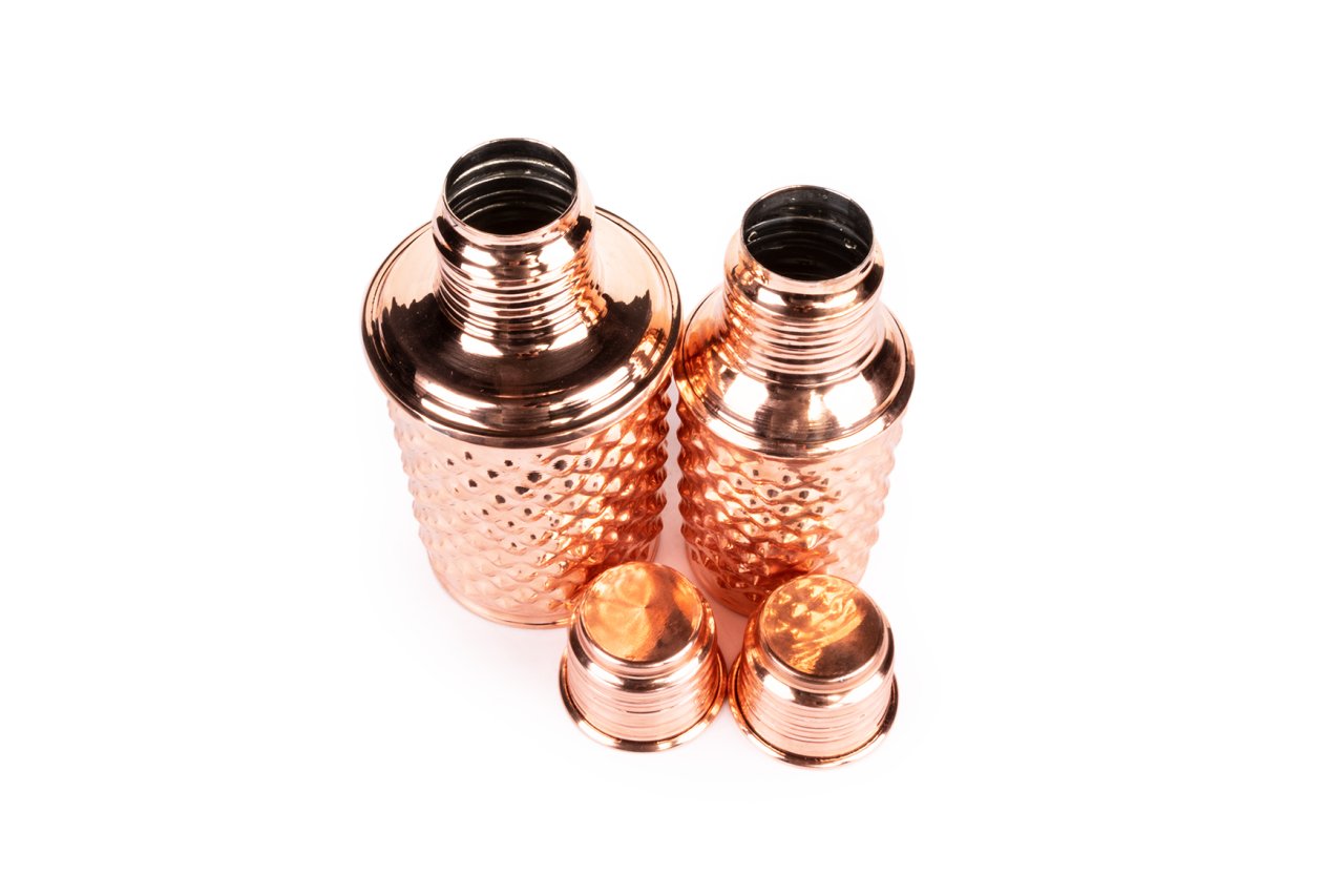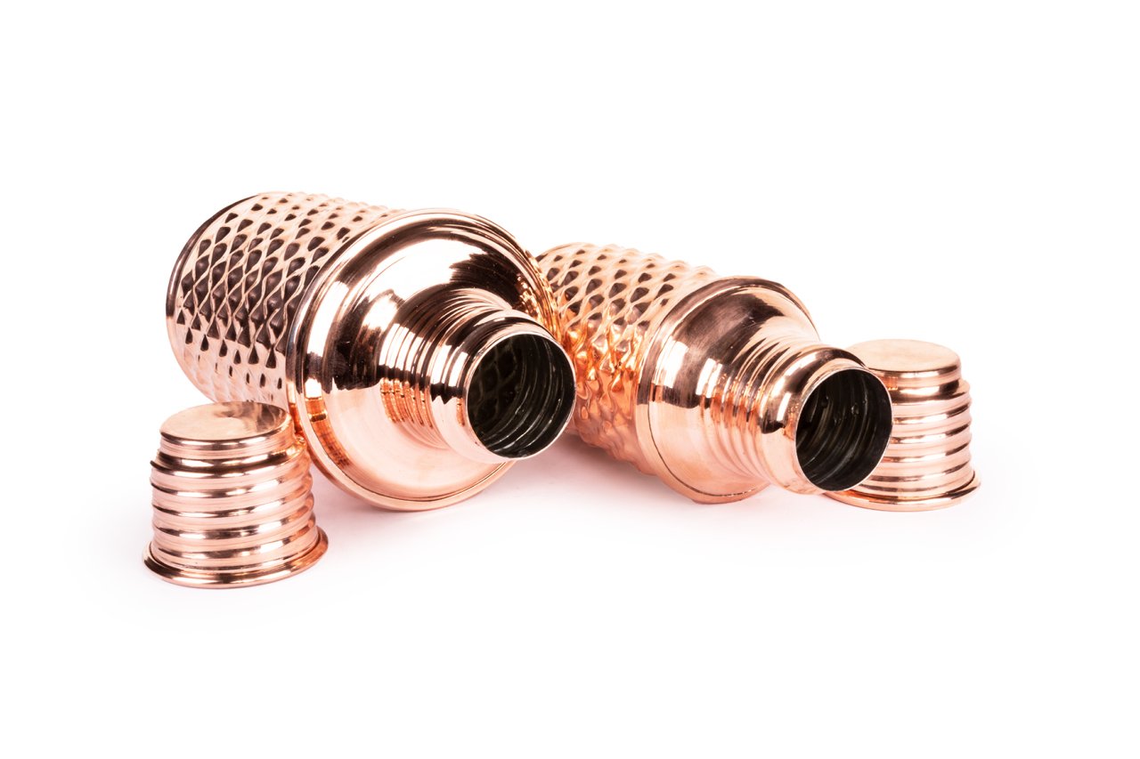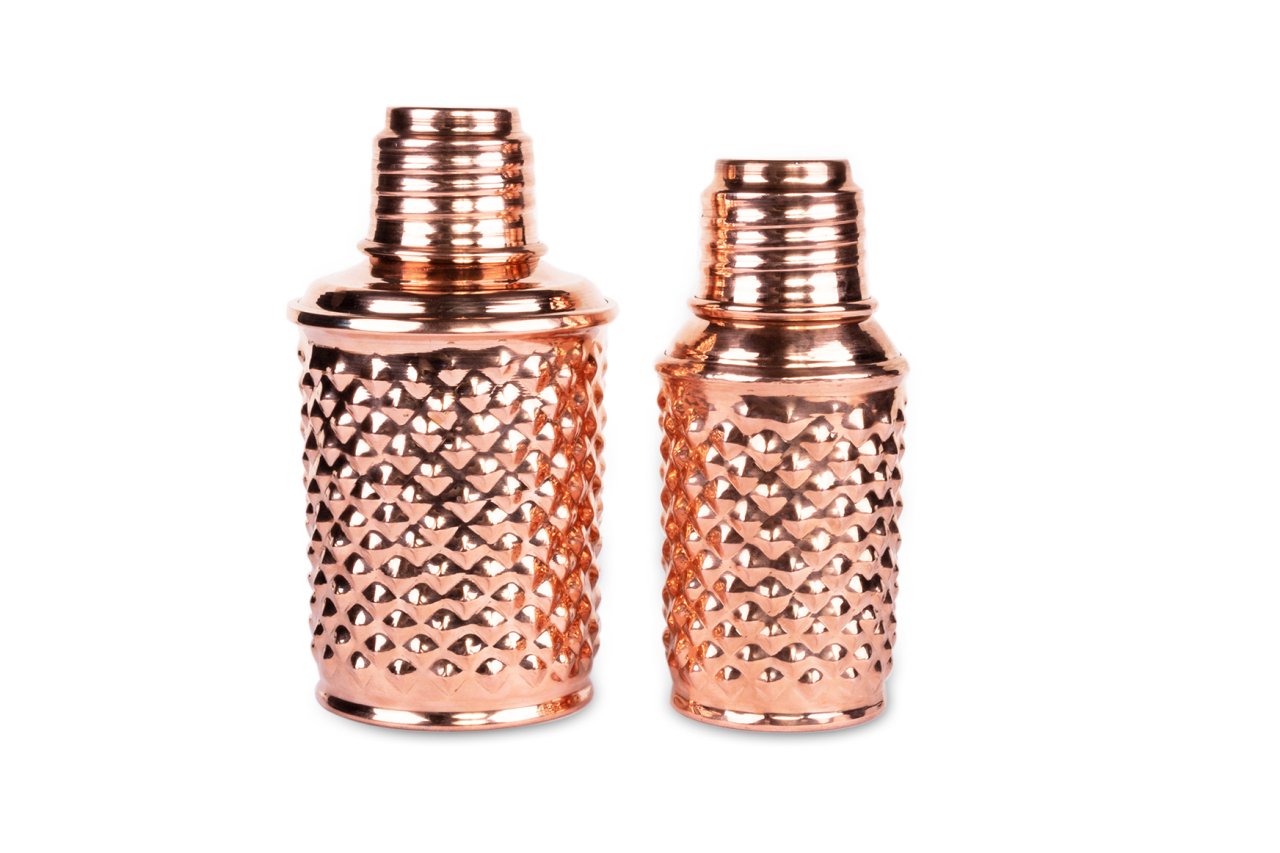 Handygoo Twin Bottle Bakır Matara, su, meyve suyu, kokteyl ve benzeri tüm soğuk içeceklerinizi muhafaza etmenin, çantanızda taşımanın ve içmenin en yeni, en havalı yolu olan yepyeni iki bakır matara ürünümüzün birlikte satışa sunulan setidir. Her ikisi de, kendi imalatımız olup %100 bakırdan üretilmiştir. İçleri kalaylıdır. Sızdırma yapmazlar. Sadece soğuk içecekler için tasarlanmıştır ve termos özellikleri bulunmamaktadır. Ufak olan bakır matara modelimiz, 400 ml hacminde olup, üzerindeki piramit desenleri ve gövdesi tamamen el yapımıdır. Bakır matara ürünümüz, 6,5 cm taban çapı ve 17 cm boy ölçüsüne sahiptir. Büyük olan modelimiz ise 750 ml hacminde olup 8 cm taban çapı ve 18.5 cm boy ölçüsüne sahiptir. Her iki modelimizi çantanızda kolayca taşıyabilirsiniz.