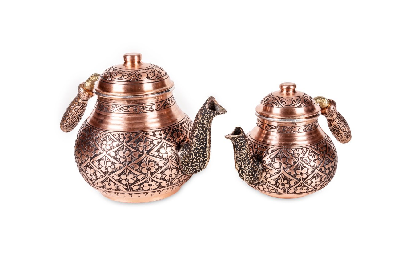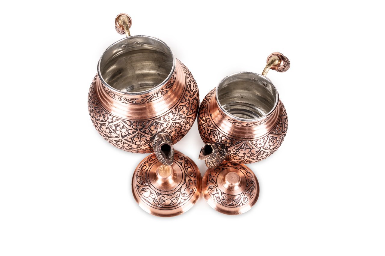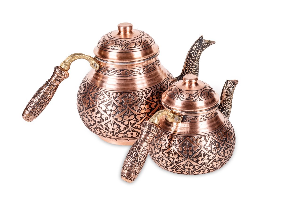 Otantika bakır çaydanlık, lezzetli çaylar demlemeniz için tasarlandı. Kahvaltıda, ara öğünlerde, yemekten sonra, tatlının yanında...Hiç şüphesiz çay içmenin yeri ve zamanı yoktur. Bu doğrultuda da çay, pek çok insan için önem verilen içeceklerin başında gelir. Gün içerisinde kimi zaman bir bardak, kimi zaman ise bir demlik çay içilebilmektedir. Ortak bir çay demleme yöntemi bulunmamaktadır ancak bilindiği üzere bakır ürünlerde demlenen, servis edilen her içeceğin lezzetinin arttığı bir gerçektir. Çayınızı demlerken, bu ürün, şık ve otantik görüntüsü ile yine fark yaratmanızı sağlayacaktır. Klasik ürün modelinde yani iki ana kısımdan oluşmaktadır. Her iki kısım üzerinde ham bakır üzerine ustaca ve sabırla işlenmiş, harmoni oluşturan çiçek desen ve işlemeleri bulunmaktadır. Su ve demlik haznelerinin uçlarındaki işlemeler ise daha da detaylandırılmış ancak bu detaylar çaydanlık üzerindeki ana desenler ile son derece uyumlu hale getirilmiştir. Her iki parçanın da birbirinden bağımsız kapakları yer almaktadır. Saplar ise çaydanlık kısımlarına kaplama ile sabitlenmiştir. Bakır çaydanlık, evinize, ofisinize yada bulunduğunuz herhangi bir mekana zerafet ve şıklık getirecektir. Kendiniz yada hediye ettiğiniz sevdikleriniz çaylarını iki kat keyif ile yudumlayacaklardır. Çaydanlık su haznesi 1,8 litre su almaktadır. Üst demlik ise 0,8 lt su almaktadır.