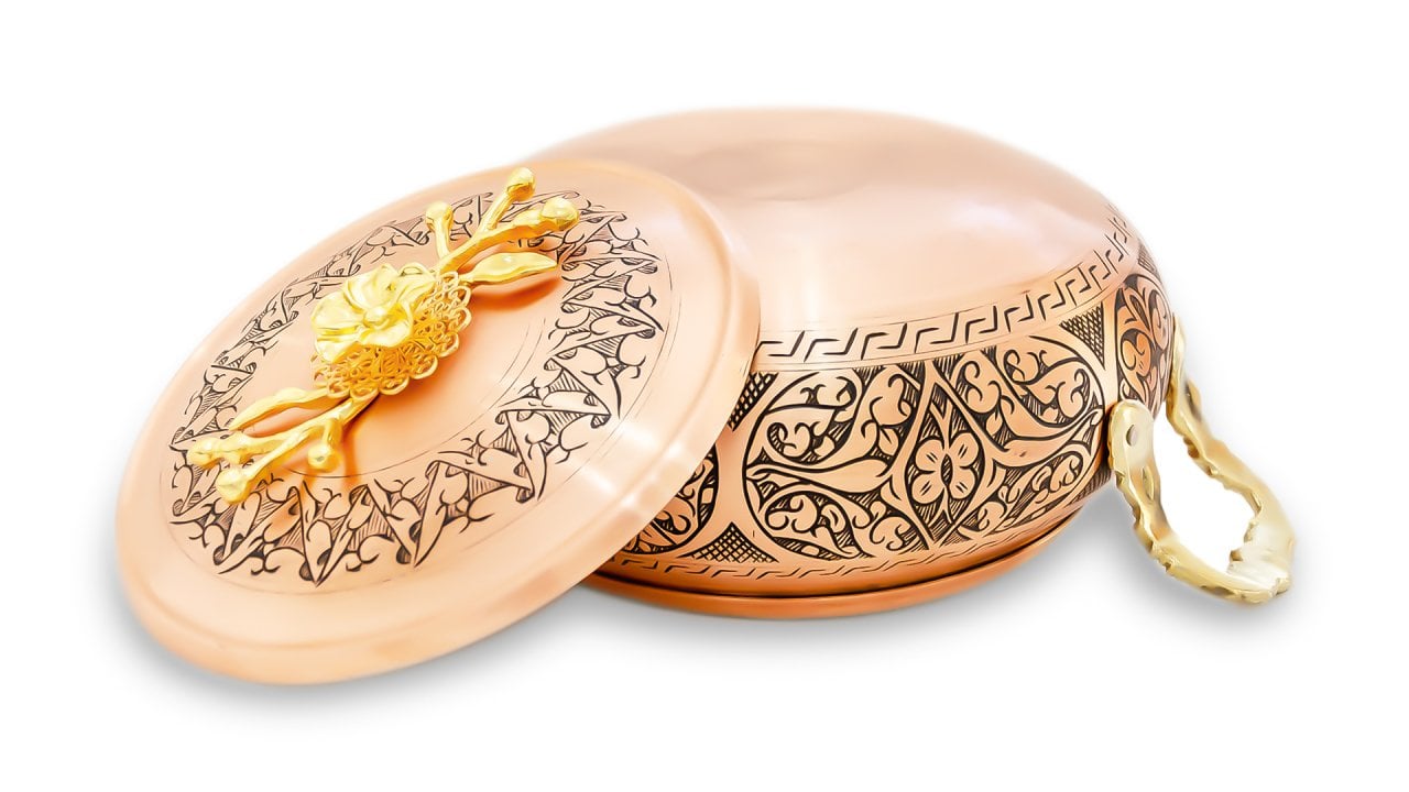 Çift kulplu sofraların sultanı bakır tencere. Bakır tencere, üzerindeki el işlemesinin büyüsünden, akıcılığından ve detayların hareketliliğinden hoşlananlar için tasarlandı. Sıcak yada soğuk tüm çorba, yemek ve benzeri servisleriniz için kullanım rahatlığı sunarken anı zamanda eviniz için son derece dekoratif bir görünüme sahiptir. Ustaların ruhundan ellerine süzülen duyguları ile dövülerek şekil aldığı  bakır tencere ürünü, en altından başlayarak el işi keski işlemesi ile çok sık, ince ve şık nakışlar ile süslenmiş, bu nakışlar, tencerenin tamamlayıcı parçası olan kapak üzerinde de detaylandırılarak, ürün üzerinde bütünlük sağlanmıştır. Tarihin şafağından bu yana, bu bakır çorbalık ve tencereler mutfakların başlıca metali olmuştur. Paslanmaz çelik, döküm, granit ve diğer tencere tipleri ile karşılaştırıldığında süper iletken olması ve yüzeyinde virüs, mikrop yaşatmaması itibariyle her zaman üstün gelmiştir. Çorbalıklar da tarifleriniz, mükemmel bir dengede lezzet bulur. Dünyadaki en ünlü şeflerin tercihi her zaman bakır tencere ve tavalar olmuştur. Yumuşak bir metal olduğu için çizilmeye müsaittir. Tencerelerin bilhassa çekiçle vurularak üretilmesinin nedeni, çizilmeye karşı gösterdiği dirençtir. Çorbalıkların iç kaplamasında kalay kullanılır. Kalay, bakırın ısı iletkenliğini korur. Girdiği her alanda çarpıcı bir etki yaratan bakırın sıcaklığı ile evinizin dekorunu ısıtabilirsiniz. Gurme tercihler ve kaliteye adanmışlığın bir sembolü olan bu tencereler, mutfağınızda kendini lezzete adamış bir şefin yaşadığına işaret edecektir. Yerel özgünlüğe verilen değerin de elçisi olan mutfaktaki bakırlarınız, ev dekorunuzun her türlü katmanıyla kolayca bütünleşip, bir zenginlik yaratacaktır. Ürünün sitemizde 4 farklı boyu yer almaktadır. Bunlar,  çap 19 cm, derinlik 8 cm, çap 24 cm, derinlik 9 cm, çap 27 cm, derinlik 10 cm ve çap 31 cm, derinlik 11 cm olacak şekildedir. Kulplar pirinç kaplamadır.